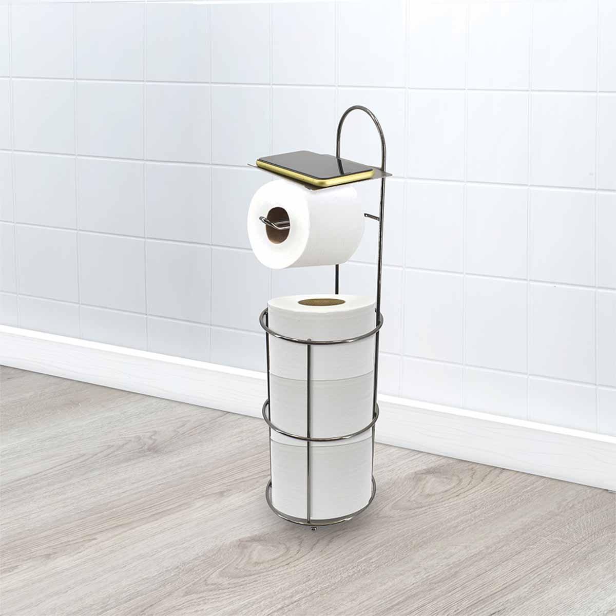 Este práctico porta rollos de diseño elegante ayuda a mantener el área del inodoro organizada ya que pone un rollo de papel a la mano para su uso diario y provee espacio para guardar más rollos de papel de reemplazo al alcance de las manos.