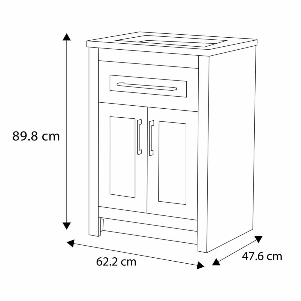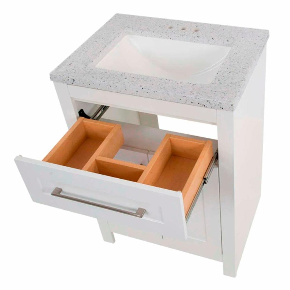 Gabinete para baño de piso Clady Home Decorators Collection, útil para almacenar y organizar objetos de higiene personal. El gabinete de 89.8 x 62.2 x 47.6 cm cuenta con laterales de aglomerado y frentes de MDF termoformado, con acabado mate que le brinda alta resistencia y larga duración, además, tiene un diseño moderno en color blanco que lo vuelve compatible con cualquier decoración. Cuenta con 2 puertas de cierre lento y 1 cajón con correderas de extensión completa. El empaque incluye una encimera tipo ceniza plateada de 2.8 x 62.2 x 47.6 cm, un lavabo blanco pretaladrado para montaje de grifo (no incluye llave mezcladora), y herrajes de níquel satinado.