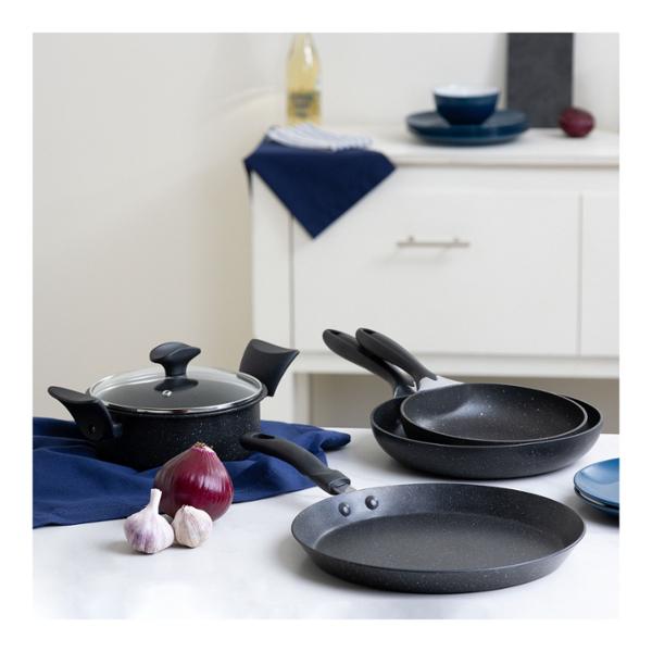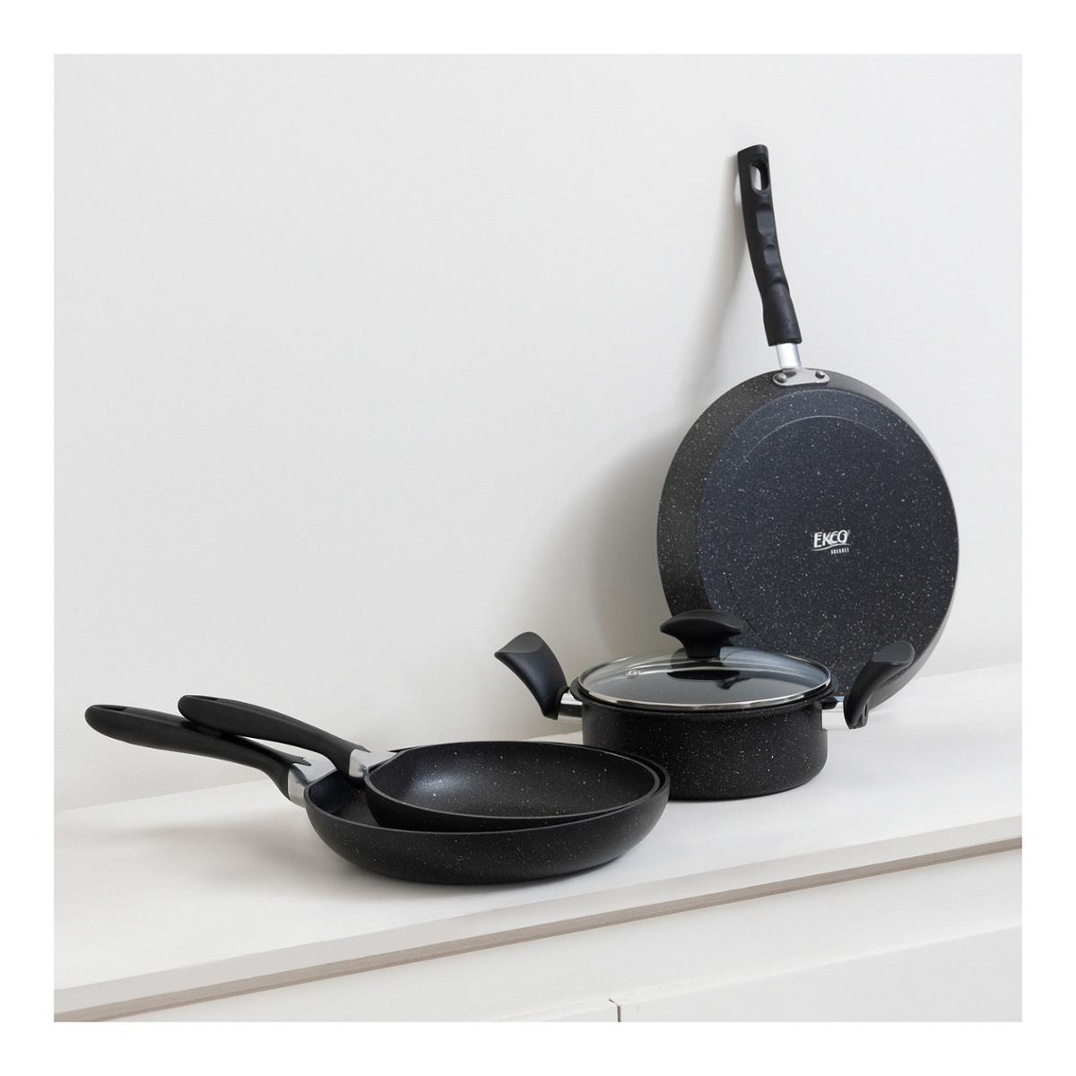 Batería de Cocina Ekco Advance 5 Piezas de aluminio Este juego de batería de cocina tiene todo lo necesario para preparar desde un platillo sencillo hasta una cena familiar. Hecha de aluminio con tecnología antiadherente Geo Stone que hará que el sabor de tus alimentos resalte, además de ayudar a que no se pegue nada en la superficie de tu sartén. Reduce tiempo, dinero y gas al momento de cocinar con esta batería de cocina, gracias a que sus componentes cuentan con un espesor de 3.0 mm que ayudan una distribución de calor mucho más uniforme. Cuenta con mangos y asas de baquelita ergonómicos que proporcionan mayor seguridad al momento del agarre evitando quemaduras. Este juego de ollas y sartenes incluye Sartenes de 20 y 26 cm Cacerola de 18 cm con tapa de vidrio Crepera de 28 cm