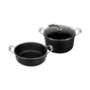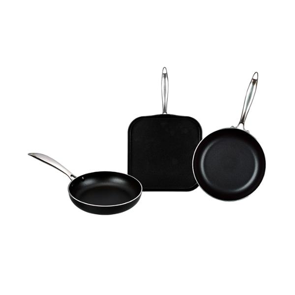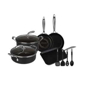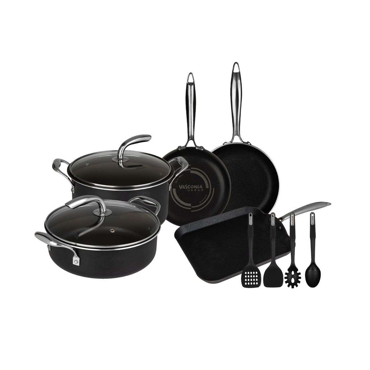 Batería de Cocina Antiadherente 11 Piezas Vasconia Urban. Este juego de batería de cocina cuenta con lo necesario para preparar tus comidas más especiales para cenas familiares, o una reunión con amigos. Hecha de aluminio con tecnología antiadherente Moonscape para uso rudo. Cocinaras de manera práctica con esta batería de cocina, gracias a que sus componentes cuentan con espesores de 2.0 mm hasta 2.8 mm que ayudan a una mejor distribución de calor en todo el cuerpo de aluminio. Cuenta con mangos y asas de acero inoxidable con doble remache que proporcionan mayor seguridad al momento del agarre. Es apta para estufa de gas, eléctrica, vitroceramica, horno y lavavajillas. Este juego de ollas y sartenes incluye Sartén 20 y 24 cm Olla de 24 cm con tapa de vidrio Plancha cuadrada Cacerola de 24 cm con tapa de vidrio 4 utensilios Vasconia doble función. Conoce nuestra nueva Línea de Productos Vasconia Urban