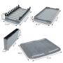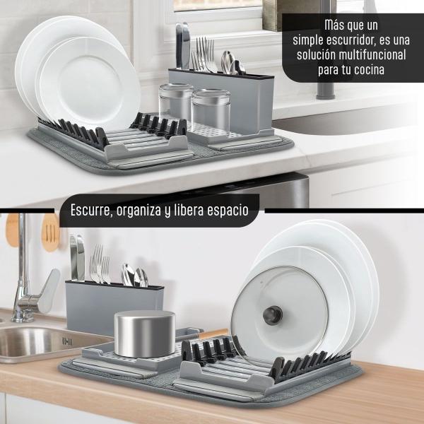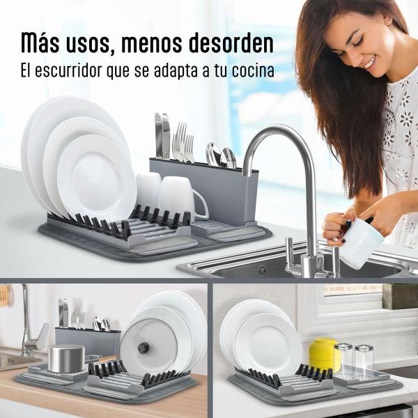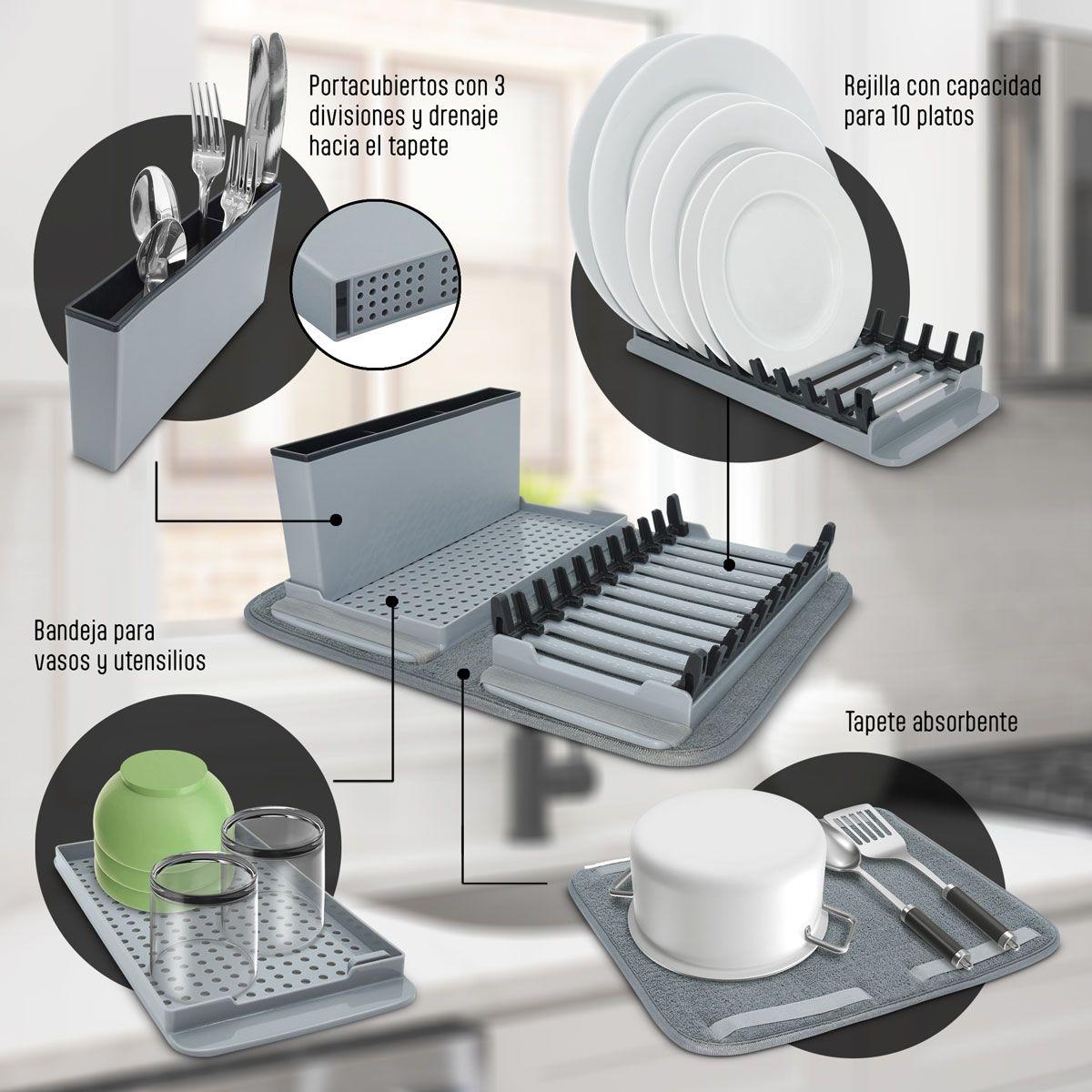 Es perfecto para escurrir trastes además de secar frutas y verduras. Se puede colocar directamente sobre la tarja para escurrir directamente al fregadero. Funciona como una superficie segura para colocar bandejas y ollas recién salidas de la estufa o del horno. Su diseño combina fácilmente con cualquier tipo de cocina. Se ajusta a la mayoría de tarjas estándar. Es enrollable lo que lo hace fácil de guardar en cajones o alacenas y ocupa poco espacio. Evita rayaduras y daños en la superficie de tu cocina.