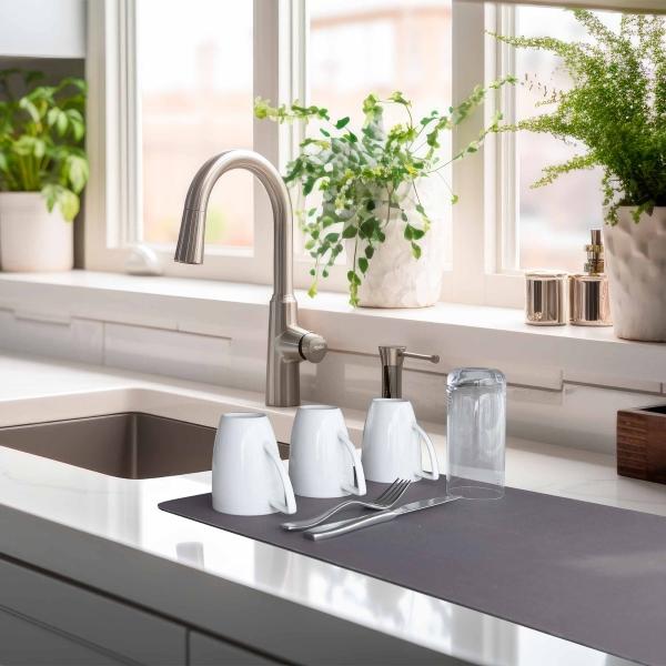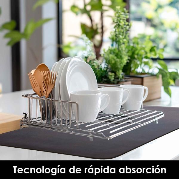 Diseñado para mantener tus encimeras impecablemente ordenadas y secas. Las gotas de agua se absorben instantáneamente y la humedad desaparece de forma inmediata, lo que elimina la necesidad de secarlos constantemente. Ya no tendras que preocuparte de que las manchas antiestéticas arruinen el aspecto de la cocina. No solo es antideslizante, sino también inodoro y resistente a rasgaduras. Este tapete se puede colocar en cualquier lugar: en la encimera de la cocina, en el escurridor, el fregadero, debajo de pequeños electrodomésticos de cocina, mesa del comedor, recipientes para mascotas, etc.