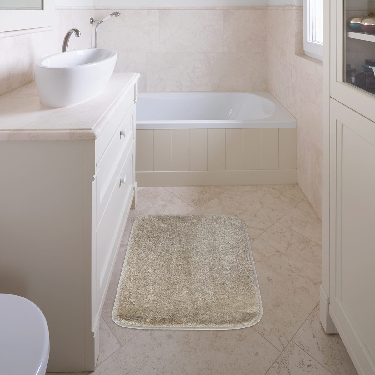 Tapete para baño Velvet Bath DiB, un elemento decorativo y funcional para complementar el sanitario. Brinda una base antideslizante, suave al tacto y de fácil mantenimiento, compuesto en poliéster y diseño de pelo corto en un atractivo color beige.