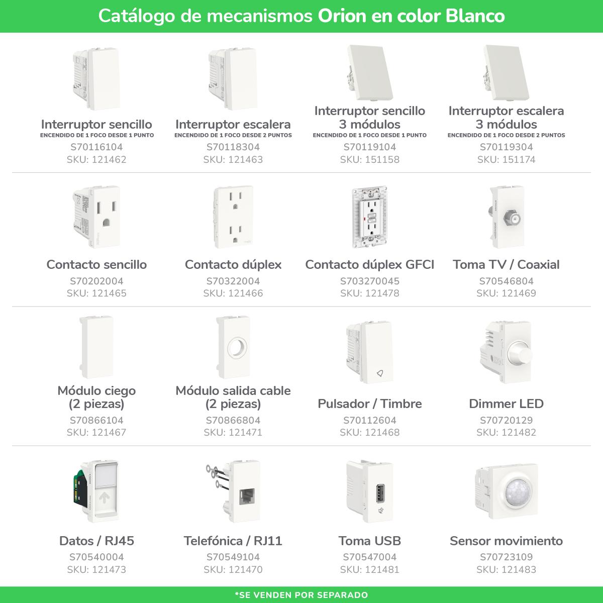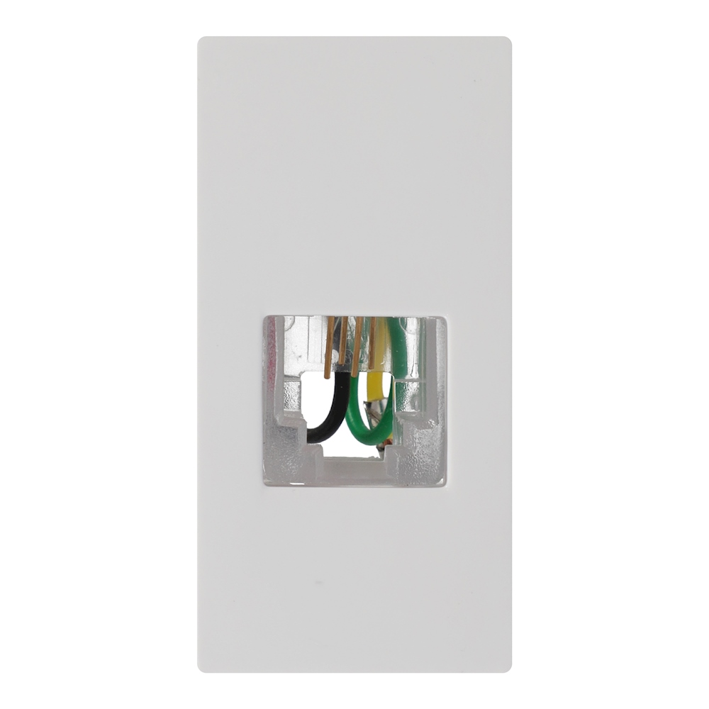 La linea de apagadores y contactos Orion se ajusta perfectamente a cada estilo de vida. Ofrece una variedad funciones combinaciones y posibilidades.Toma de teléfono RJ11 4 hilos. Color blanco. Tipo de cable par trenzado. Temperatura de operación - 5 a + 50 °C. Material Tecnopolímero ABS con filtro UV. Grado de protección IP21 D/IK05.