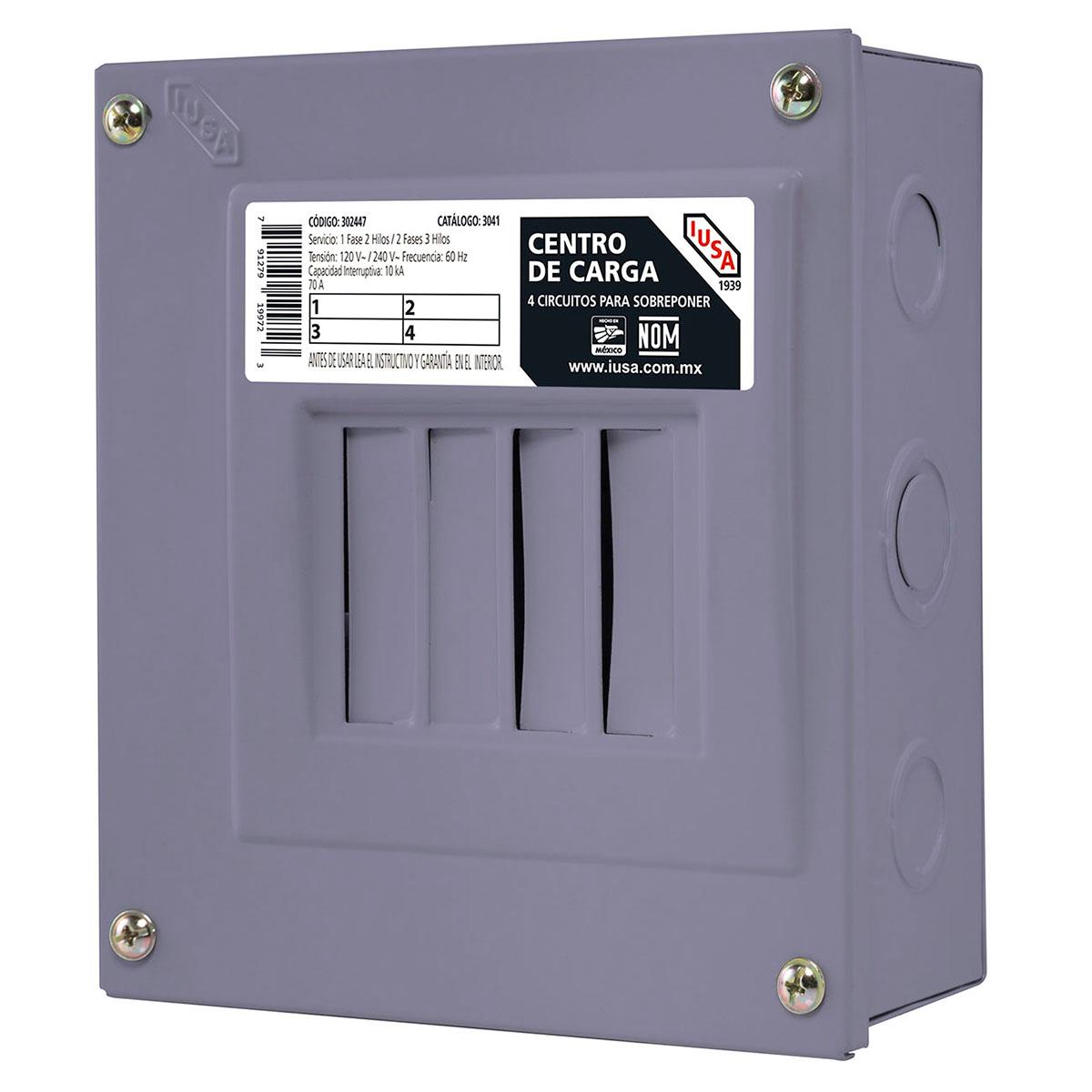 Centro de carga monofásico Iusa es útil en la correcta distribución de la energía eléctrica en inmuebles de uso residencial como comercial; que debe colocarse en las paredes interiores. Su estructura cuenta con un amplio espacio en donde colocar 4 interruptores para circuitos de 120/240 volts y 60 hertz con los servicios de 1 fase con 2 hilos y de 2 fases con 3 hilos; que soporta un máximo de 70 amperes. La tapa, que se encuentra en su frente, se cierra con tornillos para proporcionar mayor seguridad. Está construido en lámina de acero al carbón calibre 22 recubierto con pintura color gris mate, que lo hace resistente y durable, mientras que sus medidas son 44 x 33.8 x 19.9 cm. Su colocación debe realizarse de manera sobrepuesta en los muros.