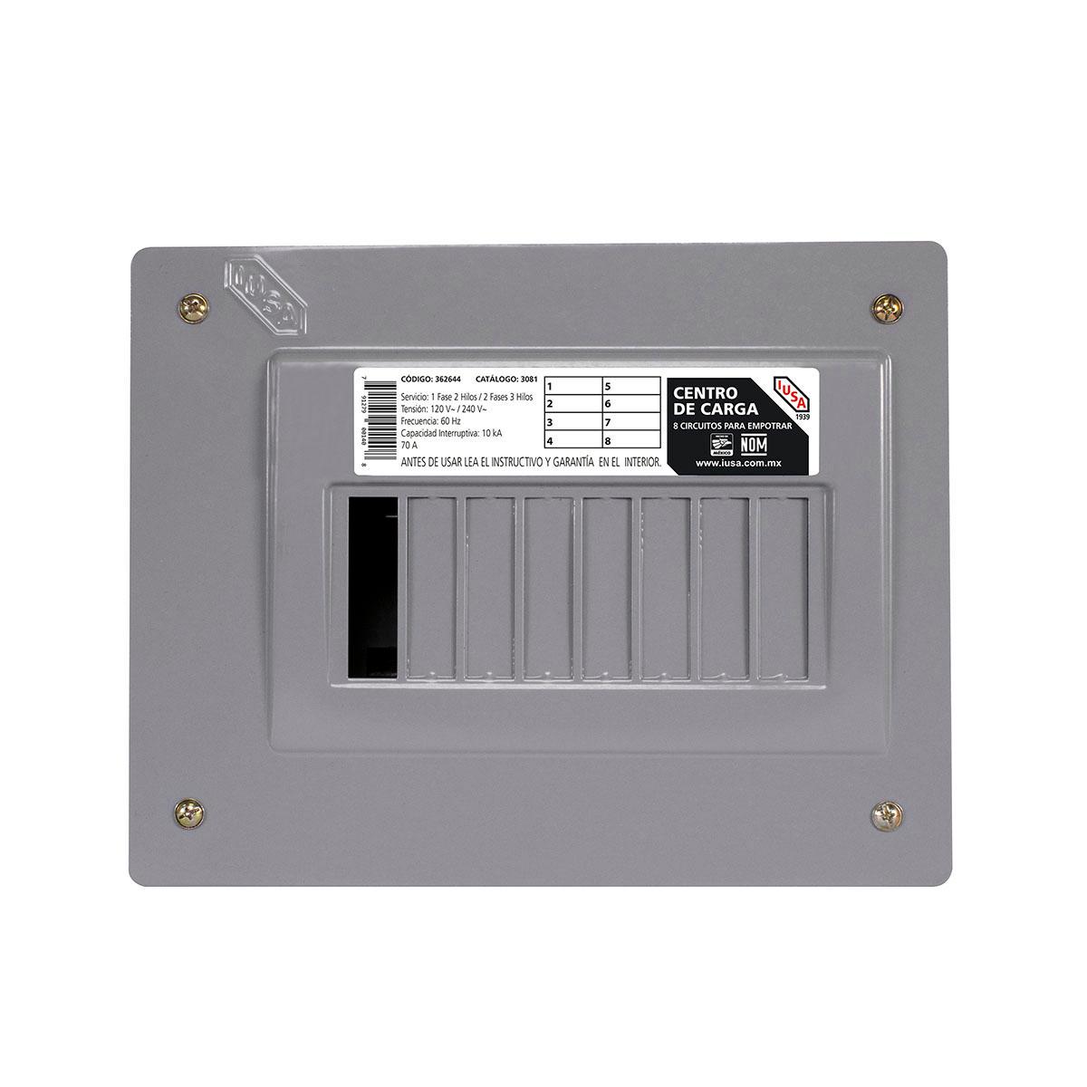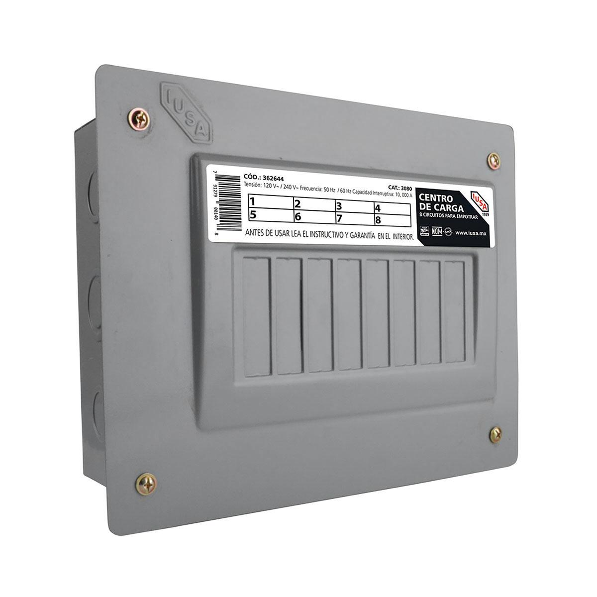 Centro de carga Iusa es útil en la correcta distribución de la energía eléctrica en inmuebles de uso residencial como comercial; que debe colocarse en las paredes interiores. Su estructura cuenta con un amplio espacio en donde colocar hasta 8 interruptores para circuitos de 120/240 volts y 60 hertz con los servicios de 1 fase con 2 hilos y de 2 fases y 3 hilos; que soporta un máximo de 70 amperes. La tapa, que se encuentra en su frente, se cierra con tornillos para proporcionar mayor seguridad. Está construido en lámina de acero al carbón calibre 22 recubierto con pintura color gris mate, que lo hace resistente y durable, mientras que sus medidas son 53.3 x 29.7 x 22.1 cm. Su colocación debe realizarse de manera empotrada en los muros.