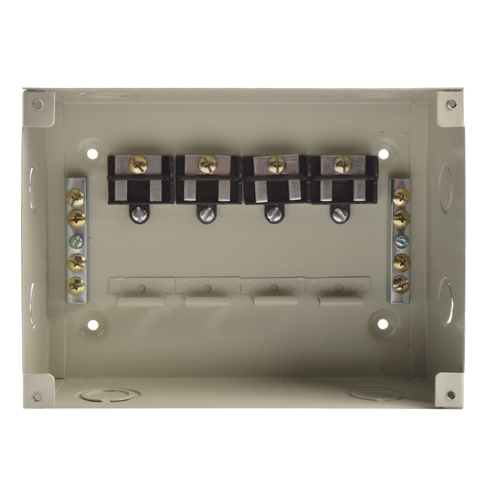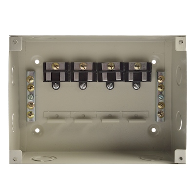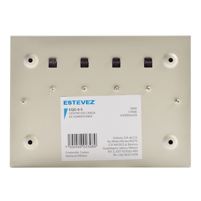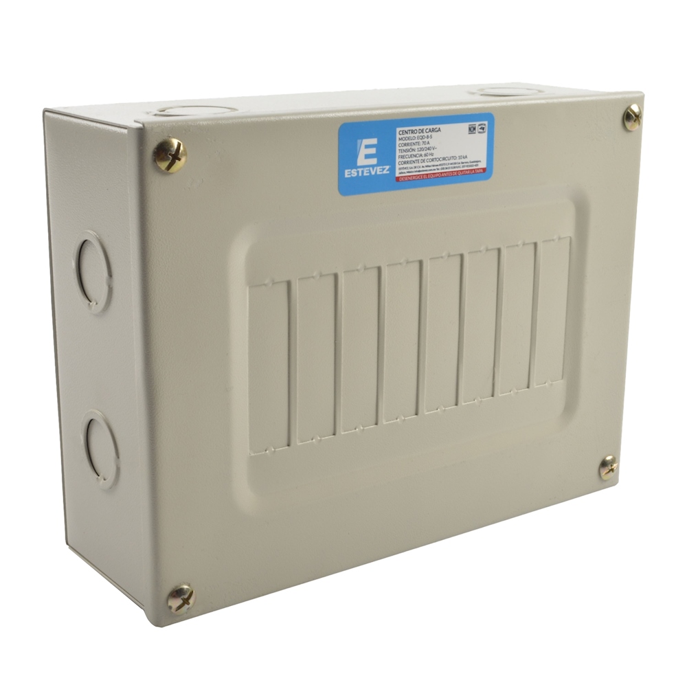 Centro de carga de sobreponer Estévez, ayuda a distribuir de manera eficaz la energía dentro de residencias o comercios. Fabricado en metal beige, con 8 módulos, 1 fase, tensión de 120 a 240 volts y corriente de 100 amperes.