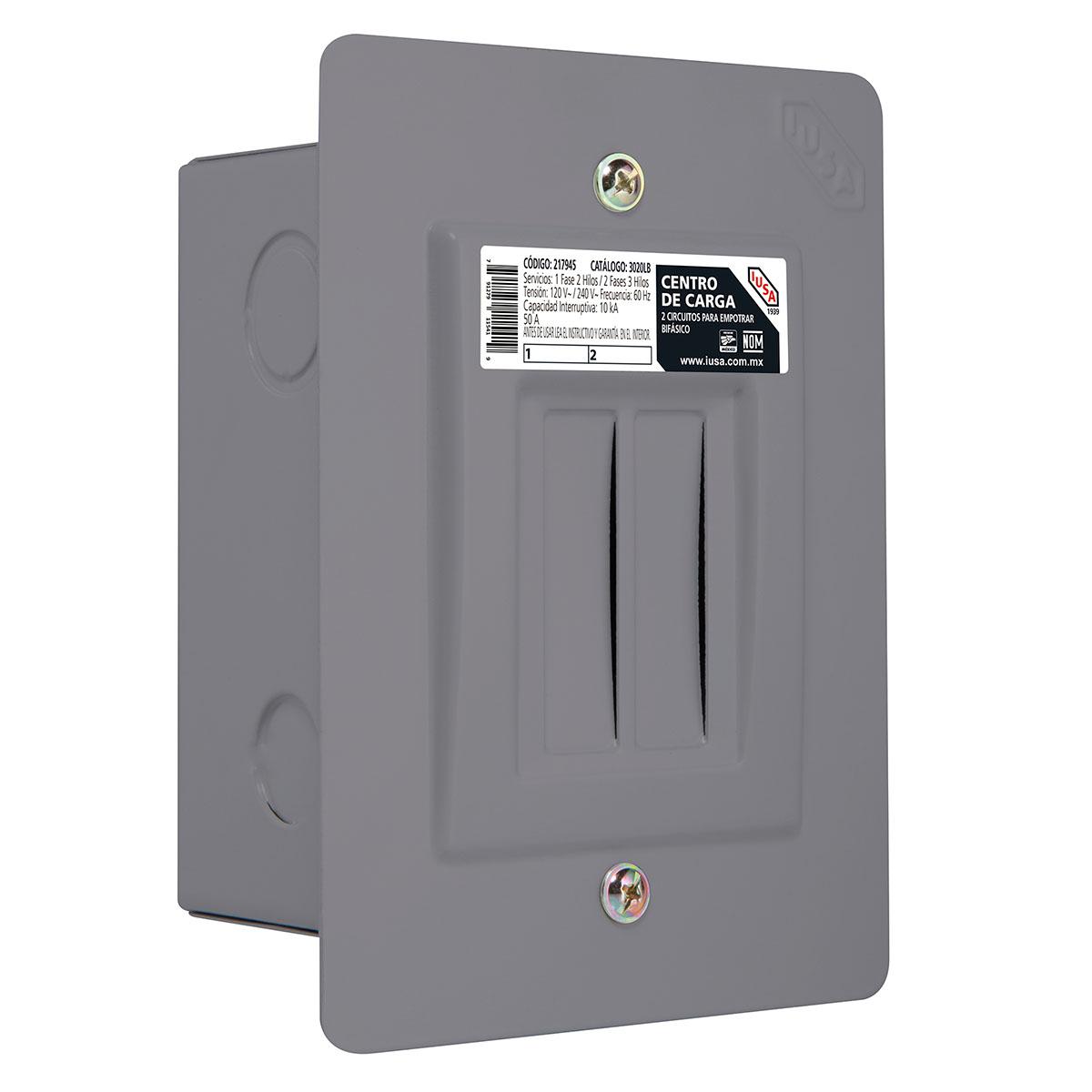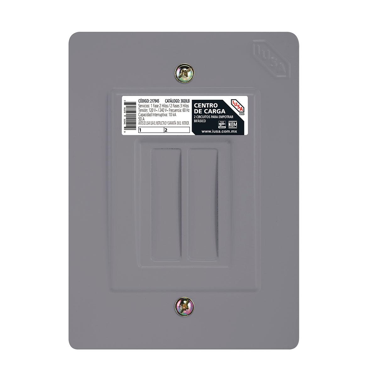 Centro de carga bifásico Iusa es útil en la correcta distribución de la energía eléctrica en inmuebles de uso residencial como comercial; que debe colocarse en las paredes interiores. Su estructura cuenta con un amplio espacio en donde colocar 2 interruptores para circuitos de 120/240 volts y 60 hertz con los servicios de 1 fase con 2 hilos y de 2 fases con 3 hilos; que soporta un máximo de 50 amperes. La tapa, que se encuentra en su frente, se cierra con tornillos para proporcionar mayor seguridad. Está construido en lámina de acero al carbón calibre 22 recubierto con pintura color gris mate, que lo hace resistente y durable, mientras que sus medidas son 42.2 x 20.4 x 16 cm. Su colocación debe realizarse de manera empotrada en los muros.