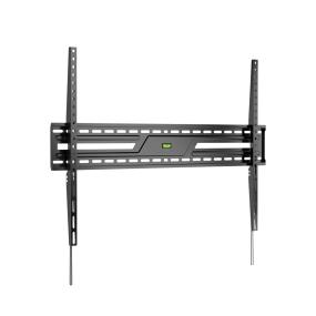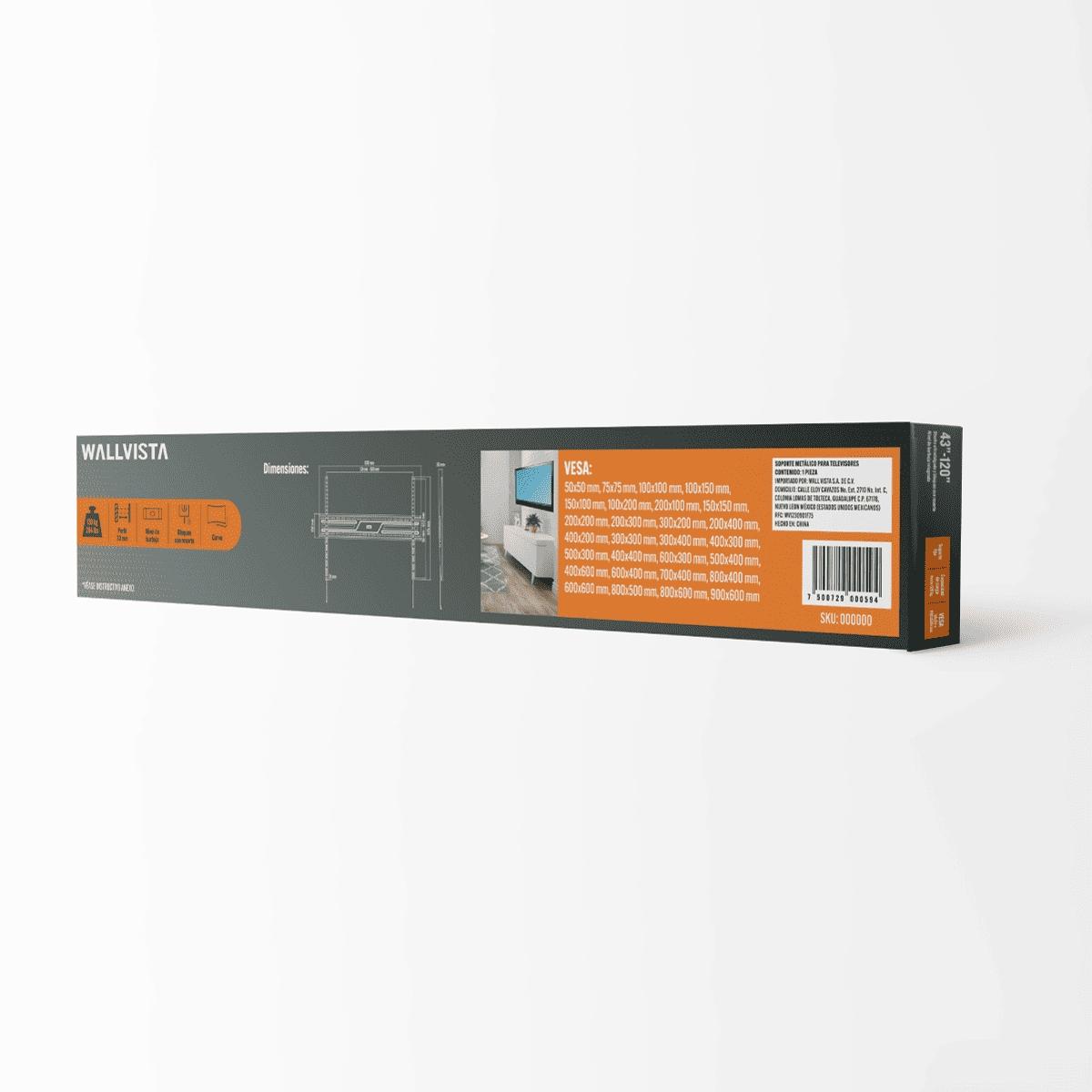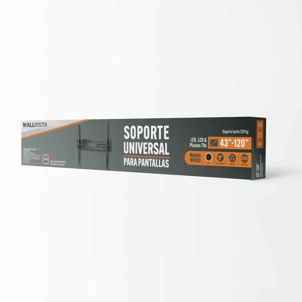 El soporte fijo está diseñado para televisores de 43 a 120 pulgadas. Asegura versatilidad con diferentes marcas y modelos de pantallas. Fabricado en acero de alta resistencia, soporta hasta 120 kg. Este soporte universal ofrece robustez y seguridad para el entretenimiento en casa. Su estructura de acero proporciona estabilidad y durabilidad, asegurando una instalación en pared sólida y discreta en cualquier ambiente doméstico. Este accesorio se adapta perfectamente a una variedad de espacios sin comprometer la estética. Ideal para quienes buscan un diseño minimalista y funcional que complemente su sala de estar o habitación, asegurando una experiencia de visualización cómoda y segura para toda la familia. El empaque incluye herrajes para facilitar su instalación.