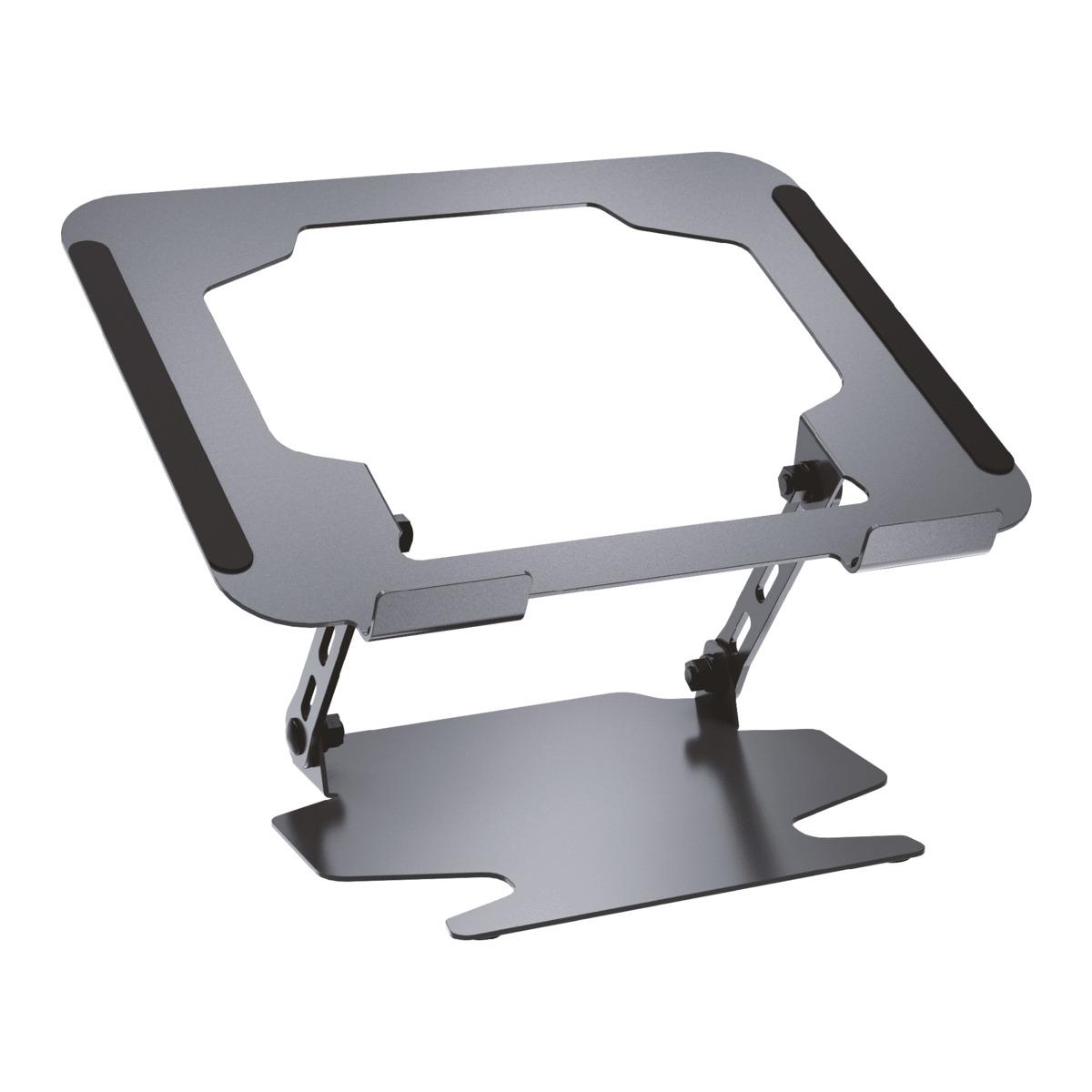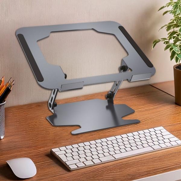 Soporte universal metálico para laptops y tablets. Diseñado para dispositivos de hasta 17.3 pulgadas y con capacidad de soportar hasta 20 kg, este soporte metálico ofrece un giro de 180 grados para mayor flexibilidad y comodidad en el uso diario. Su diseño ergonómico eleva la altura de tu laptop o tablet, mejorando la postura y reduciendo la fatiga durante largas horas de trabajo o entretenimiento. Además, cuenta con una base abierta que puede disipar eficazmente el calor y evitar que la computadora se sobrecaliente. Para mayor seguridad, incluye gomas de silicón antideslizantes que protegen tus equipos de raspones y evitan movimientos no deseados. Ideal para quienes buscan versatilidad, durabilidad y confort en un solo accesorio.