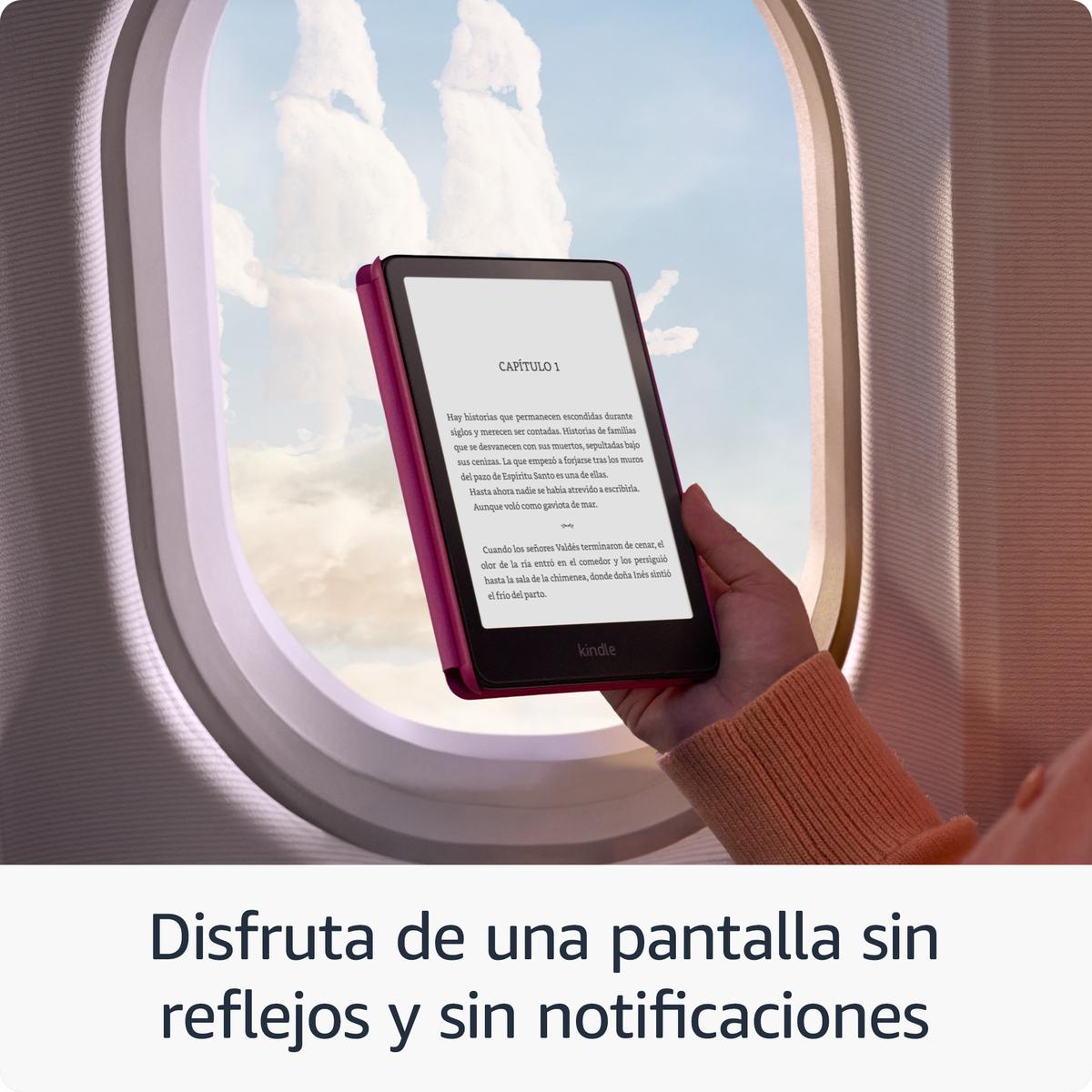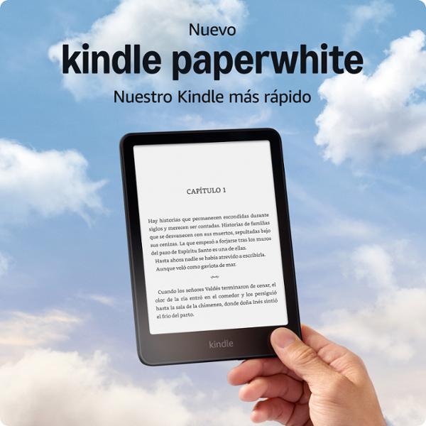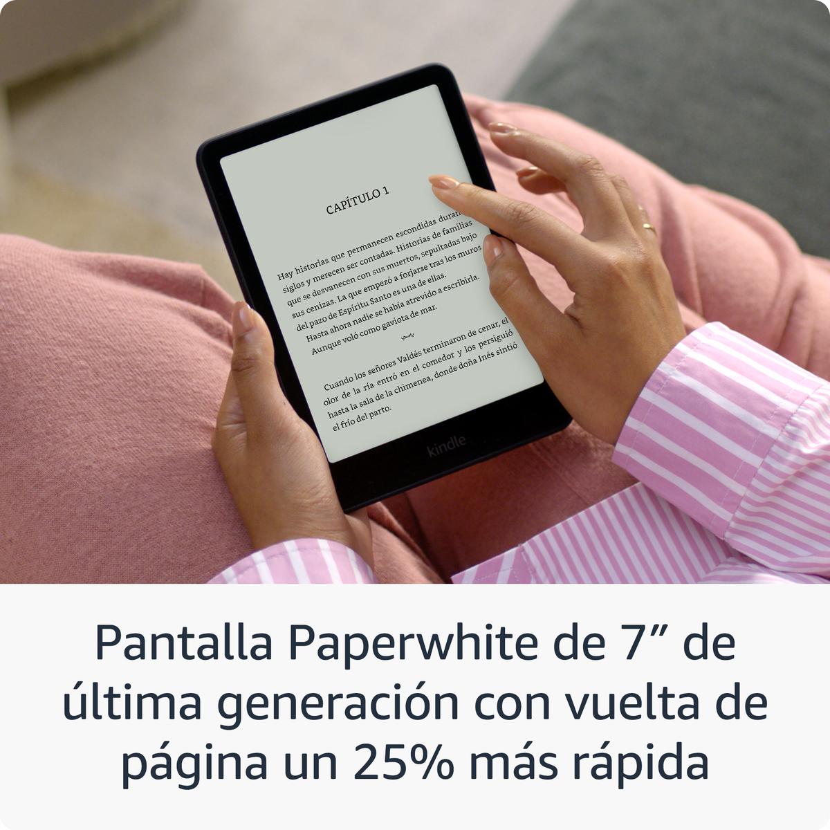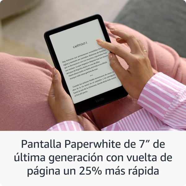 Nuestro Kindle más rápido de la historia: La pantalla Paperwhite de 7" de próxima generación tiene una relación de contraste más alta y vuelta de página 25% más rápida. Mejora tu experiencia de lectura: Cuenta con una luz frontal que se ajusta automáticamente, carga inalámbrica y 32 GB de almacenamiento. Listo para viajar: El diseño ultradelgado tiene una pantalla más grande sin reflejos para que las páginas se mantengan nítidas sin importar dónde estés. Se adapta a tu entorno: La luz frontal con ajuste automático te permite leer con la luz más brillante del sol o hasta altas horas de la noche. Una sola carga mediante USB-C dura hasta 12 semanas o se carga con una base de carga inalámbrica (se vende por separado). Impermeable y sin preocupaciones: Llévate tus relatos a la piscina, a la bañera o a cualquier lugar otro lugar. Accede instantáneamente a más de 15 millones de títulos en la Tienda Kindle en todo el mundo.