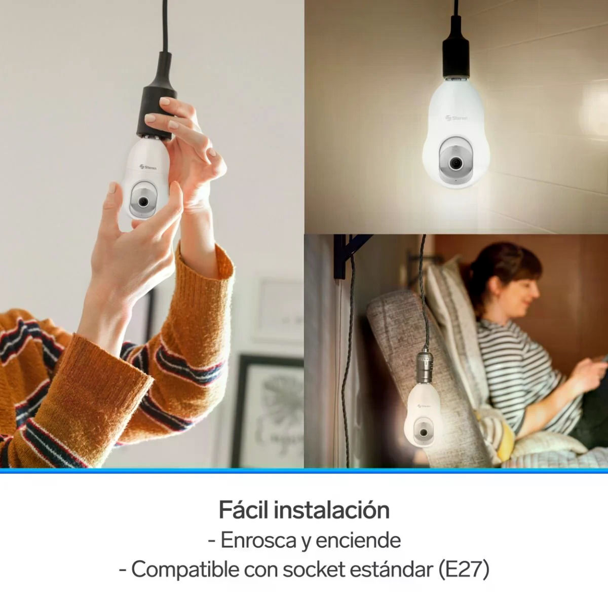 Esta cámara es una solución avanzada para la seguridad del hogar, permitiendo monitoreo en tiempo real desde cualquier lugar. Resolución de 3MPX (2304 x 1296 px), ofrece imágenes detalladas y nítidas, superando la calidad Full HD. Diseño innovador con rosca E27, permite instalarla fácilmente en cualquier socket estándar sin necesidad de cables. Se conecta a Wi-Fi de 2.4 GHz, brindando acceso remoto a través de la App Steren Home, compatible con iOS y Android, o desde un navegador web. Con detección y seguidor de movimiento, enviando alertas al celular y ajustando su ángulo automáticamente. También incluye detección de sonido, visión nocturna con LED infrarrojos, audio bidireccional con micrófono y bocina. Función de sirena para activar una alarma desde la aplicación. Su sistema de almacenamiento admite tarjetas microSD de hasta 128GB y utiliza compresión de video H.265 para optimizar el espacio. Además, incorpora 6 LED, cuerpo fabricado en ABS alimentación de 100-200V~ 50/60Hz 200mA.