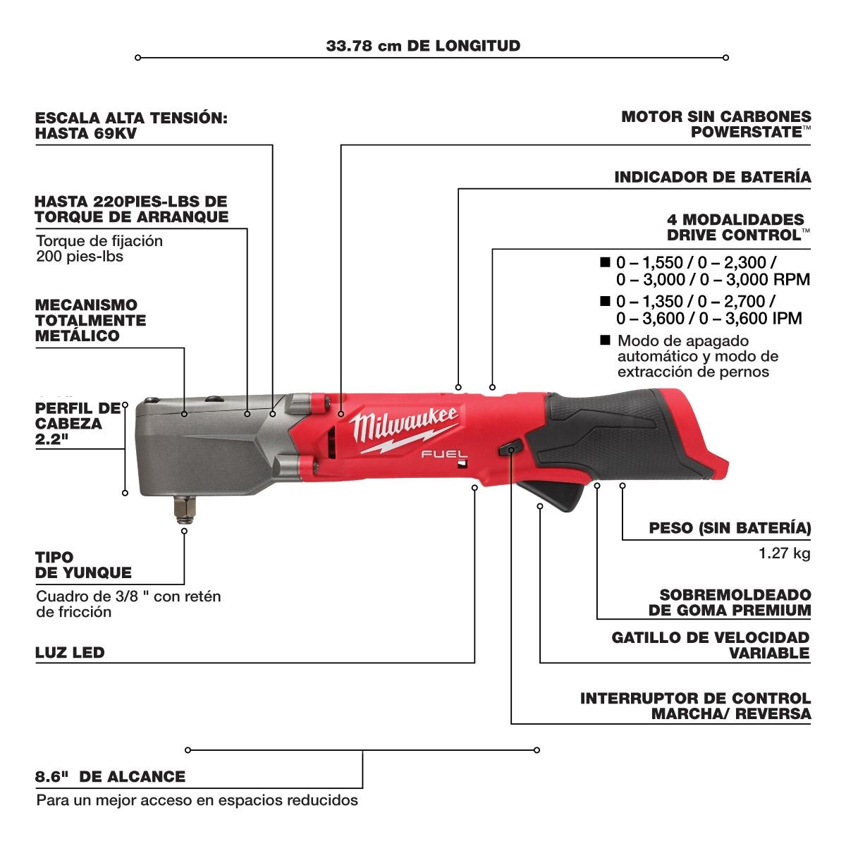 LLAVE DE IMPACTO DE 3/8 PULGADAS DE ANGULO RECTO CON ANILLO DE FRICCION MILWAUKEE M12 FUEL