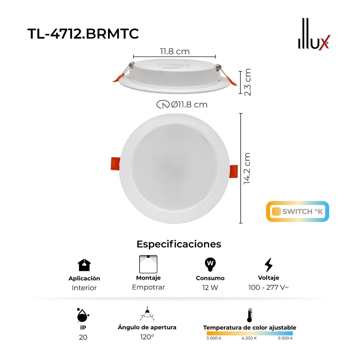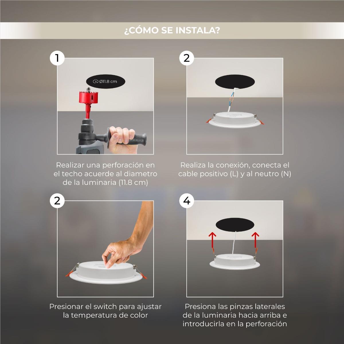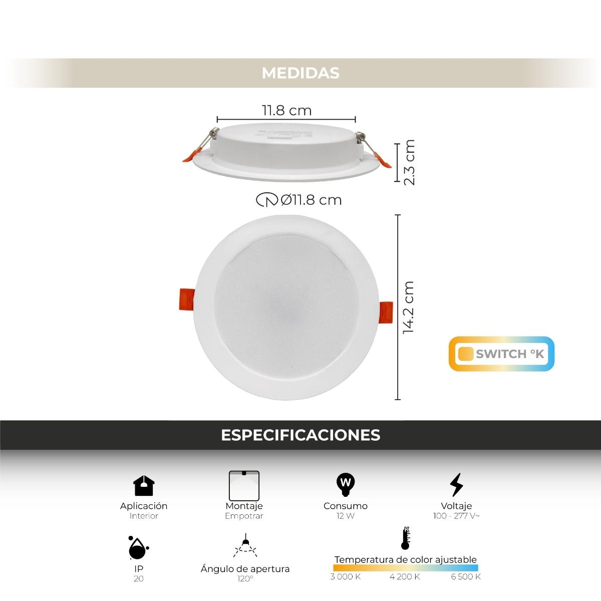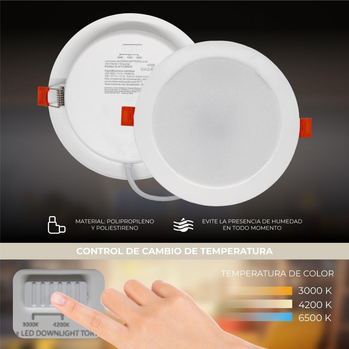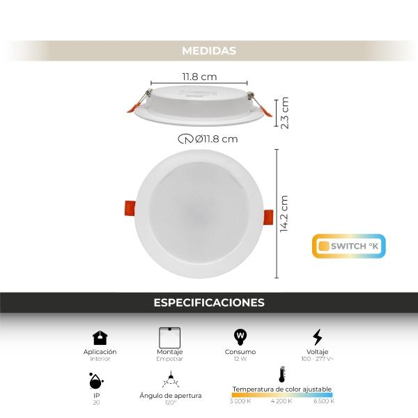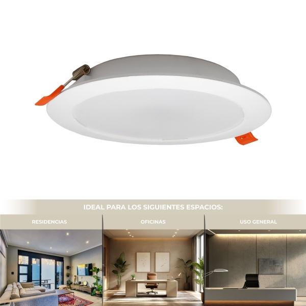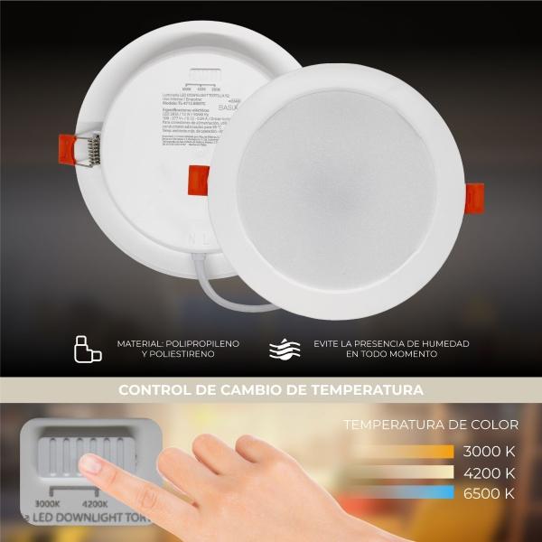 LAMPARA LED REDONDA TIPO DOWNLIGHT DE EMPOTRAR 12W, 3 TEMPERATURAS DE COLOR 3 000 K, 4 200 K y 6 500 K, USO INTERIOR
