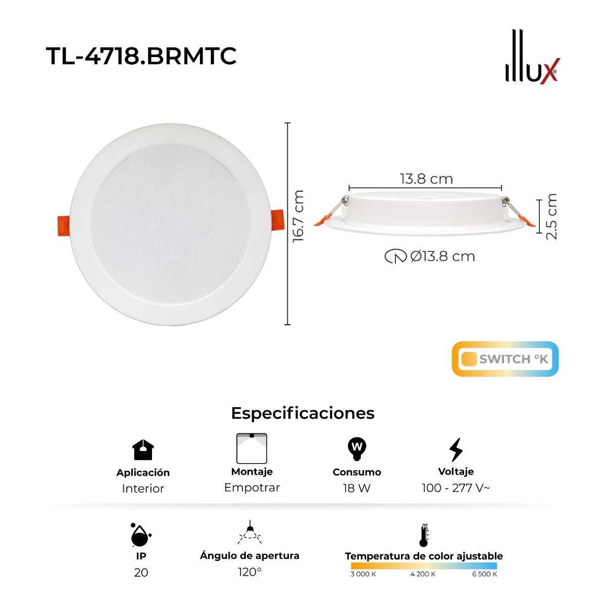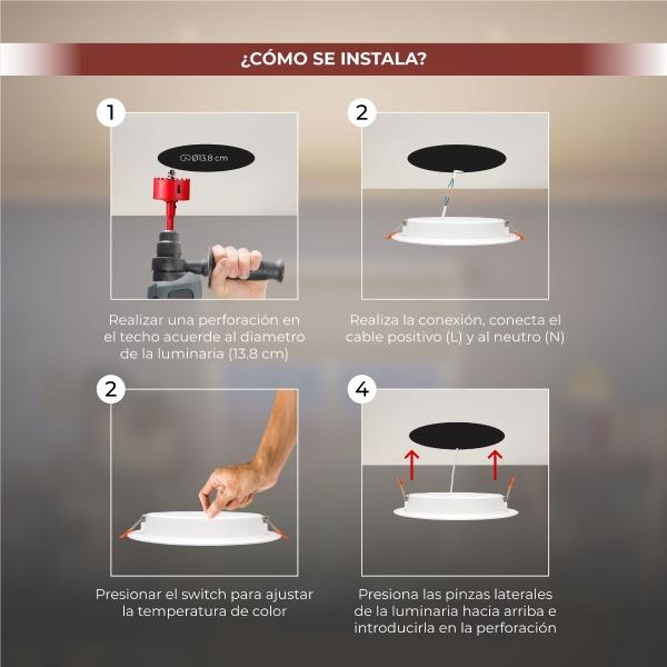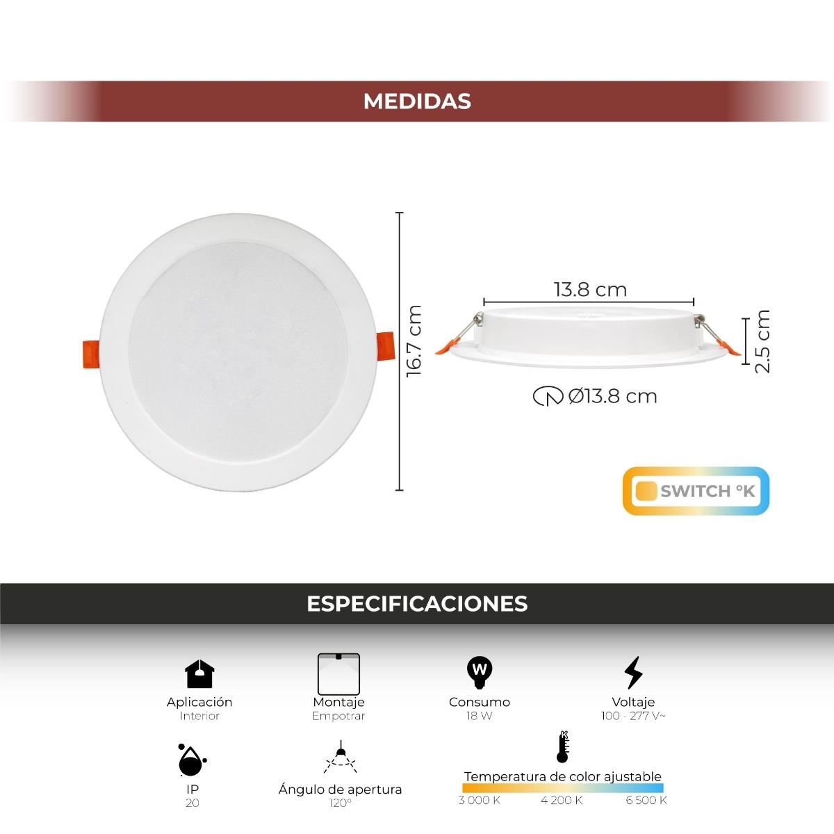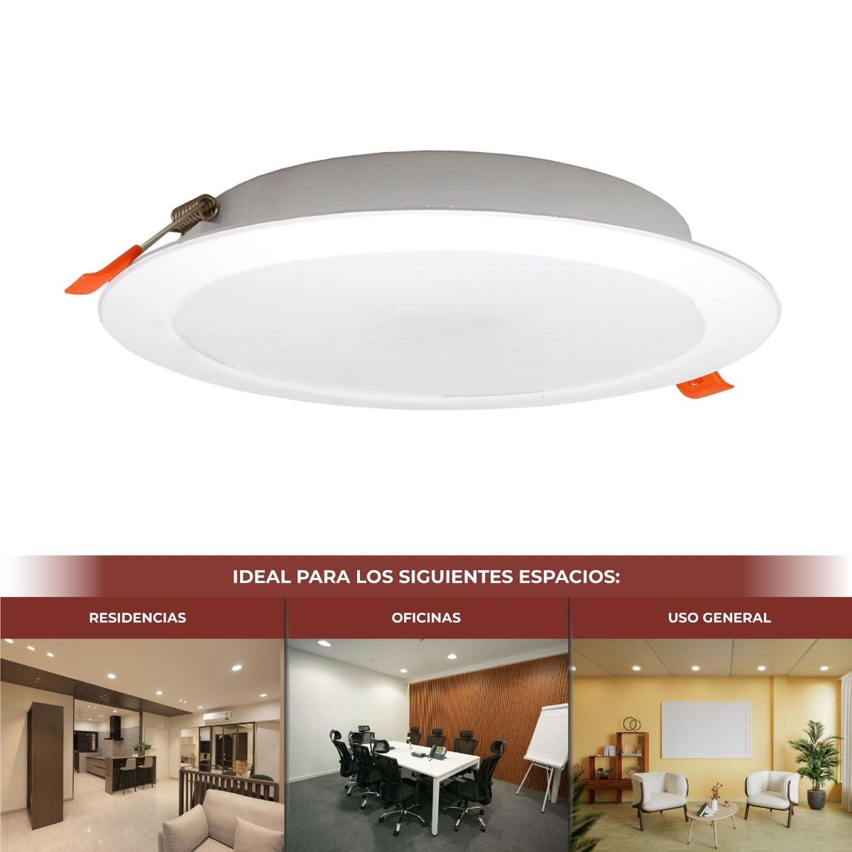 LAMPARA LED REDONDA TIPO DOWNLIGHT DE EMPOTRAR 18W, 3 TEMPERATURAS DE COLOR 3 000 K, 4 200 K y 6 500 K, USO INTERIOR