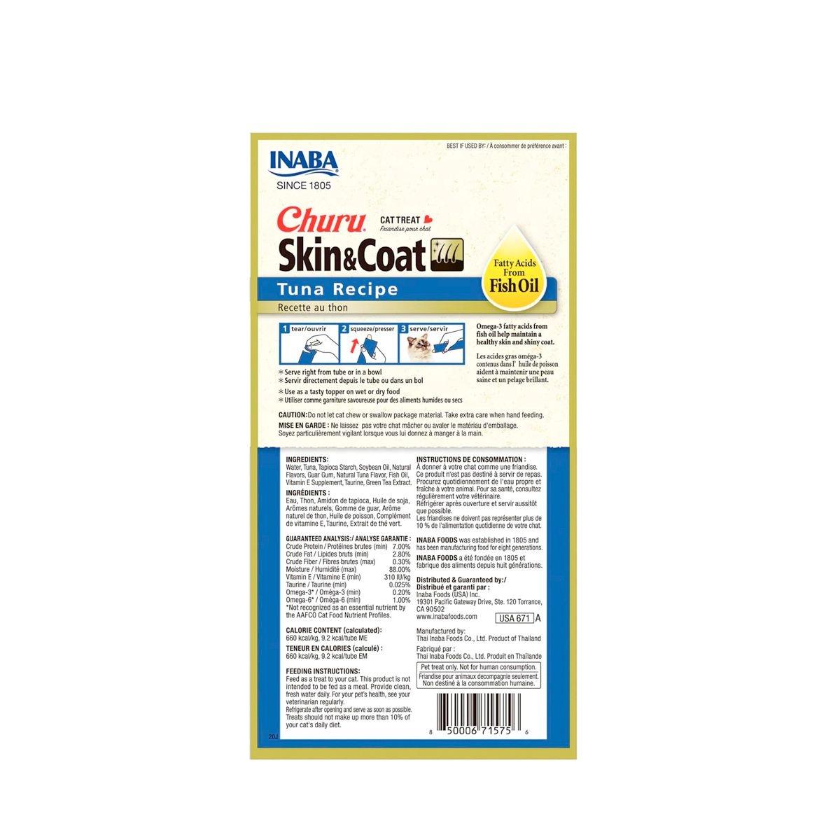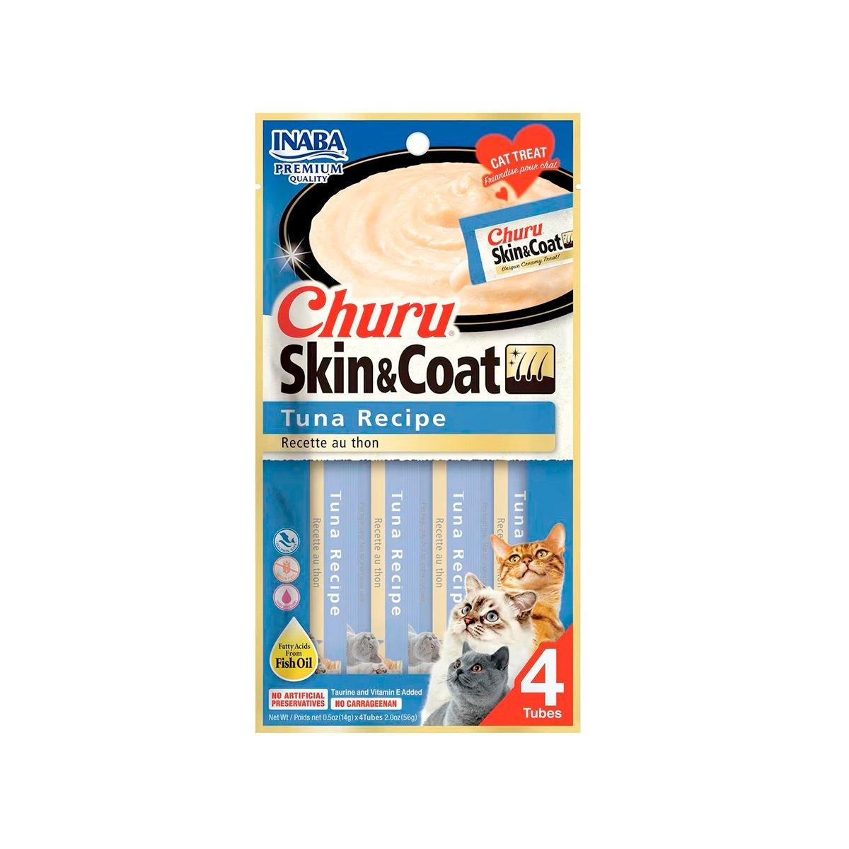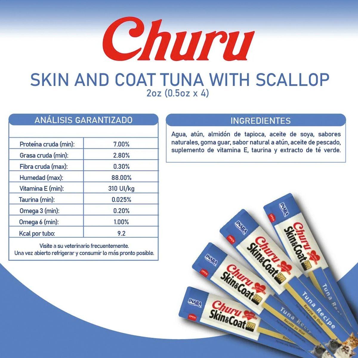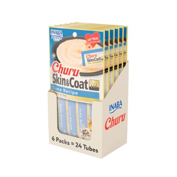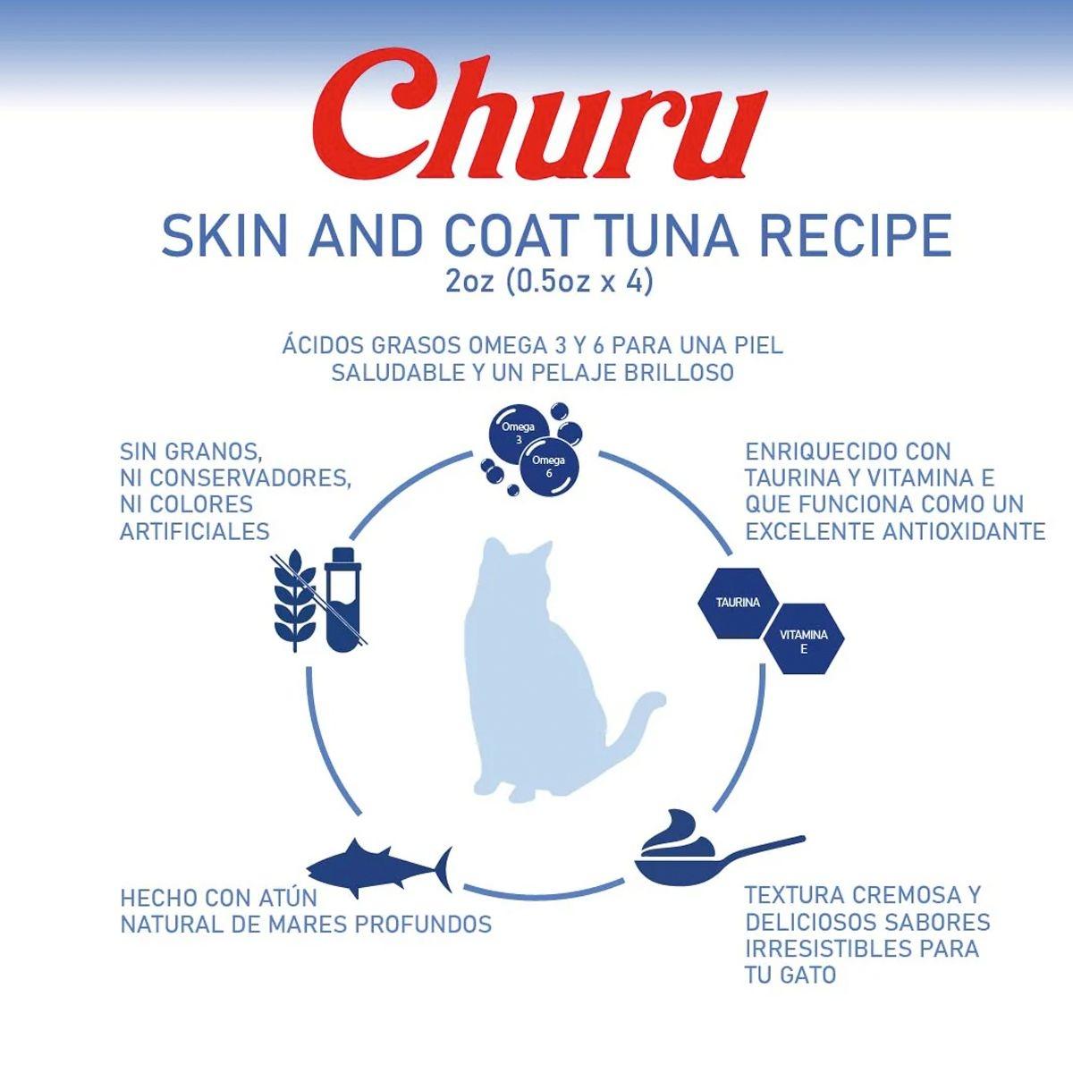 PREMIO CHURU GATO PIEL Y PELO, ATÚN Y VIERA CREMOSO BAJO EN CALORÍAS 6 PAQUETES DE 4 TUBOS