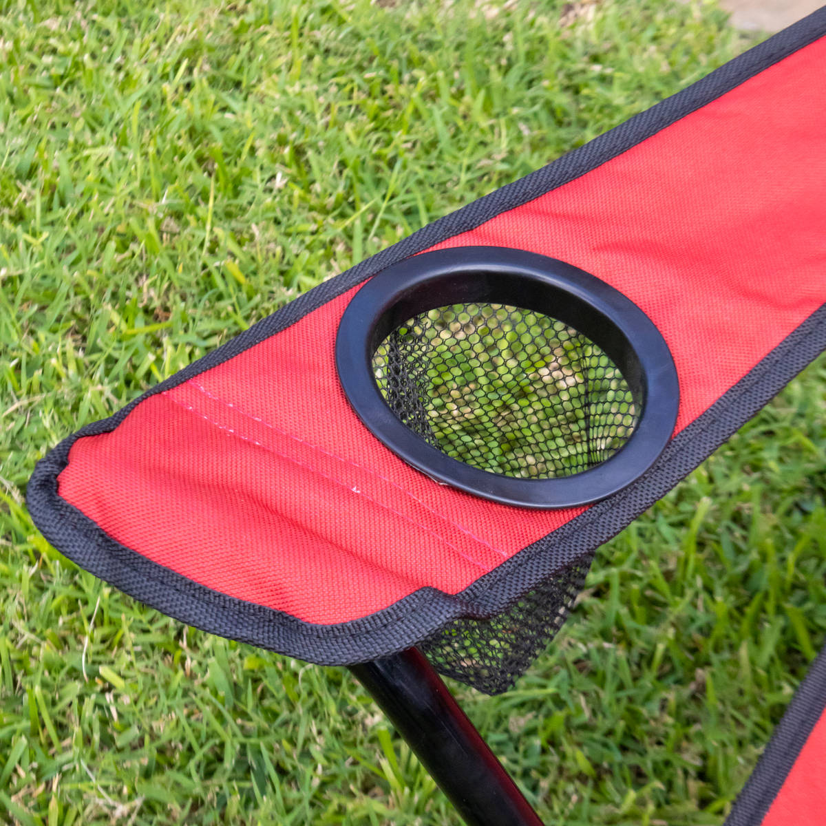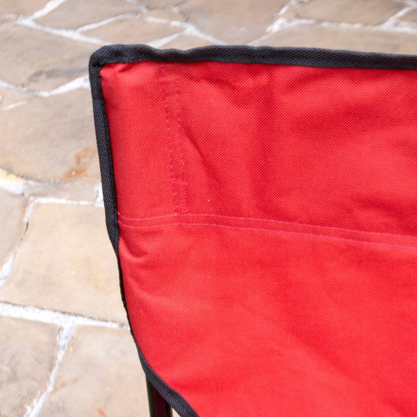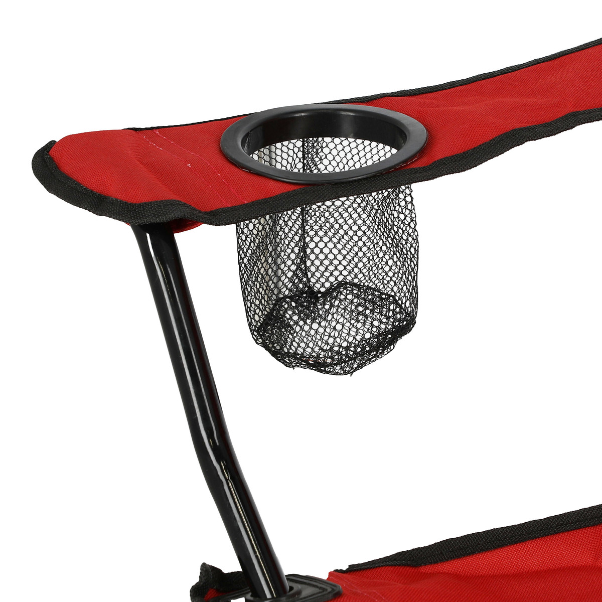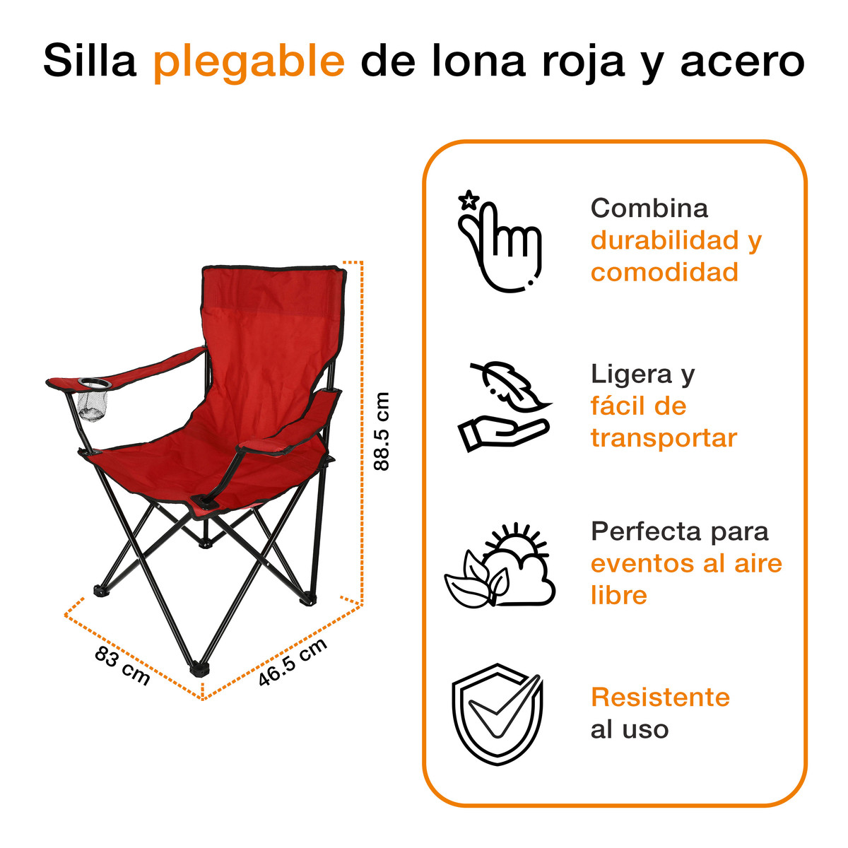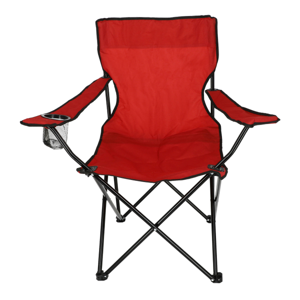 Silla con estructura plegable ligera que se convierte en tu aliada para disfrutar momentos al aire libre con mayor comodidad, gracias a su asiento de tela roja con textura suave y respaldo amplio que aporta soporte estable. Estructura con reposabrazos integrados, y uno de ellos incorpora un portavasos de malla que mantiene tu bebida al alcance mientras te relajas. La base metálica de acero en color negro brinda firmeza y estabilidad, con un diseño cruzado que facilita el plegado sin esfuerzo. Su tela muestra un acabado resistente y flexible que se adapta a tu postura, ideal para acompañarte en picnics, campamentos o eventos. Al terminar de usarla, la guardas fácilmente en su bolsa roja con asa, práctica para transportar y almacenar. Sus dimensiones son 88.5 cm de alto por 83 cm de ancho y 46.5 cm profundidad, optimizan espacio y preservan la silla en buen estado.