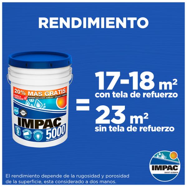 Impermeabilizante impac 5,000 fibratado de 22.8 l, formulado a base de resinas acrílicas y fibras sintéticas. Posee características de alto poder reflejante (color terracota), base agua, resistente a los movimientos normales de la construcción de losas monolíticas, por lo que evita las filtraciones de humedad. Cuenta con filtro solar uv-shield ii que proporciona propiedades para conservar durante más tiempo la blancura y elasticidad del impermeabilizante. Se adhiere a los materiales de construcción más usuales, como concreto, lámina galvanizada, fibrocemento, ladrillos, ductos, entre otros.