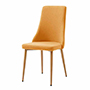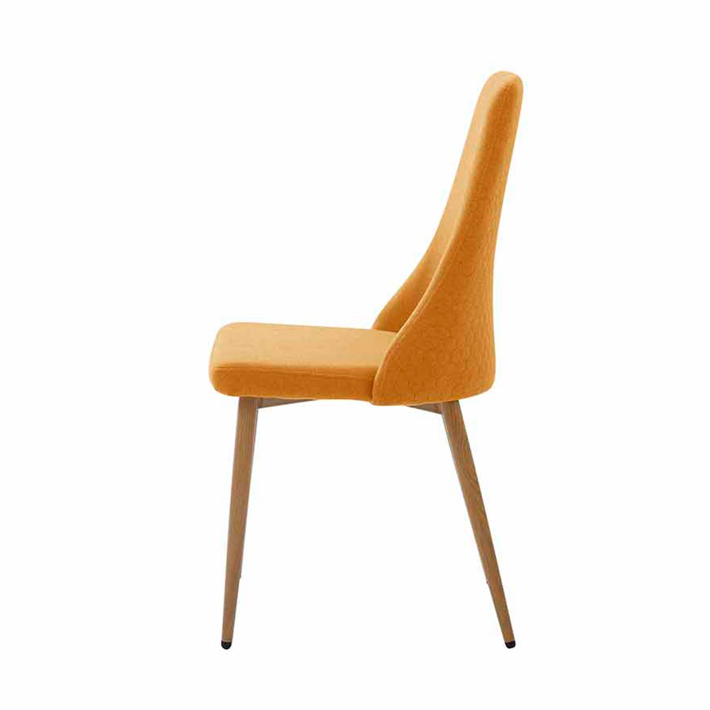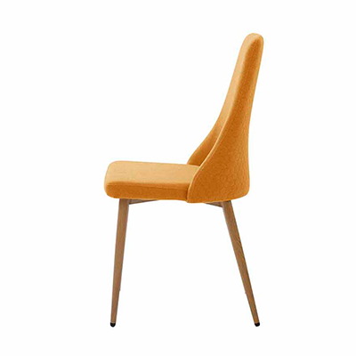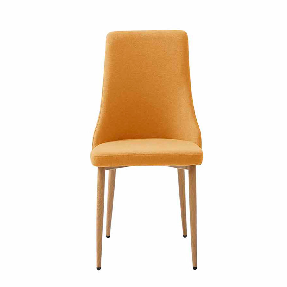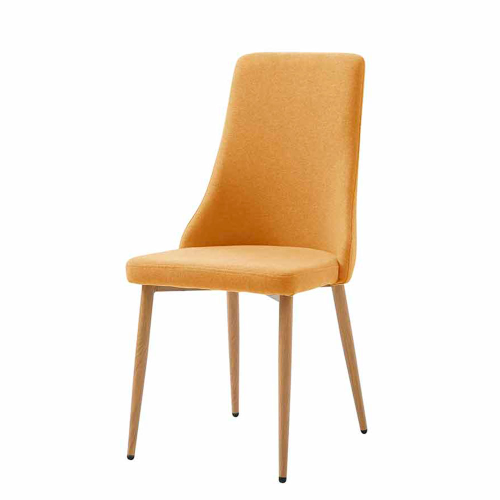 Silla tapizada en tela y con patas de metal efecto madera. Asiento acolchado. El respaldo tiene una forma que envuelve toda la zona media de la espalda, para más comodidad en la zona lumbar.