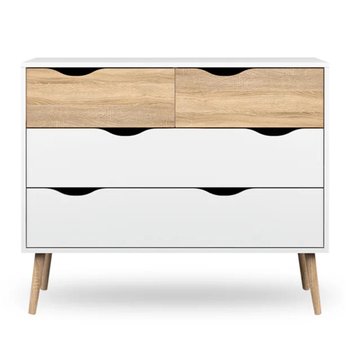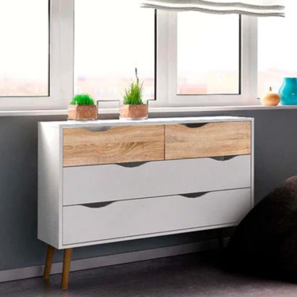 Si necesitas un mueble auxiliar para aligerar el armario de ropa, por qué no aprovechar y apostar por la originalidad? El diseño de esta cómoda de 4 cajones Nordik llevará un nuevo aire a la decoración de tu hogar y te resultará muy práctica. Sus patas alargadas le dan un toque diferencial y la combinación de colores te ayudará a que encaje con el ambiente de tu recámara. En su interior podrás guardar aquellas prendas que conserves dobladas, ropa interior y complementos. La cómoda de 4 cajones Nordik te ayudará a ordenar mejor tu ropa con un mueble auxiliar que rompe con lo tradicional. Mantenimiento limpiar con un paño humedecido en agua. No utilizar solventes ni abrasivos