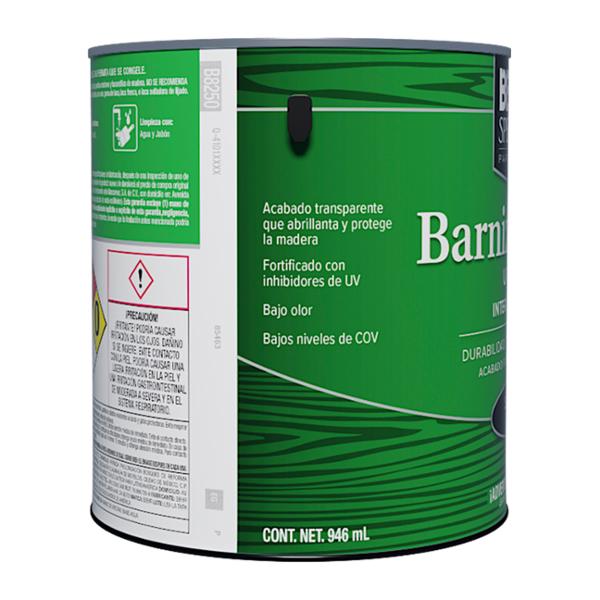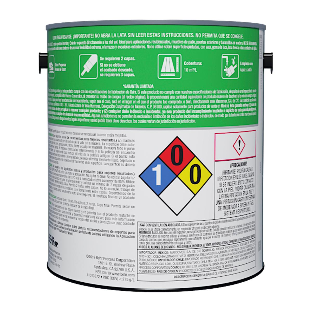 Barniz marino de 946 ml transparente cristal Behr, es adecuado para superficies interiores o exteriores como puertas, molduras, armarios, paneles o gabinetes. Está fortificado con inhibidores de rayos UV.