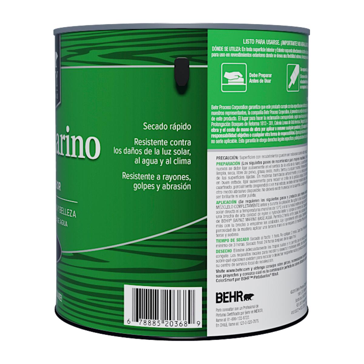 Barniz marino de 946 ml transparente cristal Behr, es una resina acrílica de uretano base agua que protege y abrillanta la madera. Está fortificado con inhibidores de rayos UV, es resistente a los rayones, golpes y abrasión, brinda durabilidad y excelente dureza con buenas propiedades al lijar y una aplicación de secado rápido, resistente a los cambios de temperatura. Es adecuado para superficies interiores o exteriores como puertas, molduras, armarios, paneles o gabinetes. Otorga un acabado satinado con un rendimiento de 10 m2 por litro.