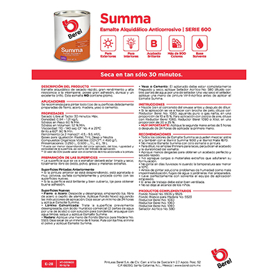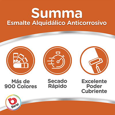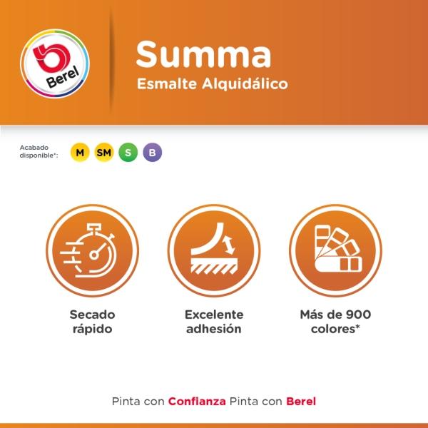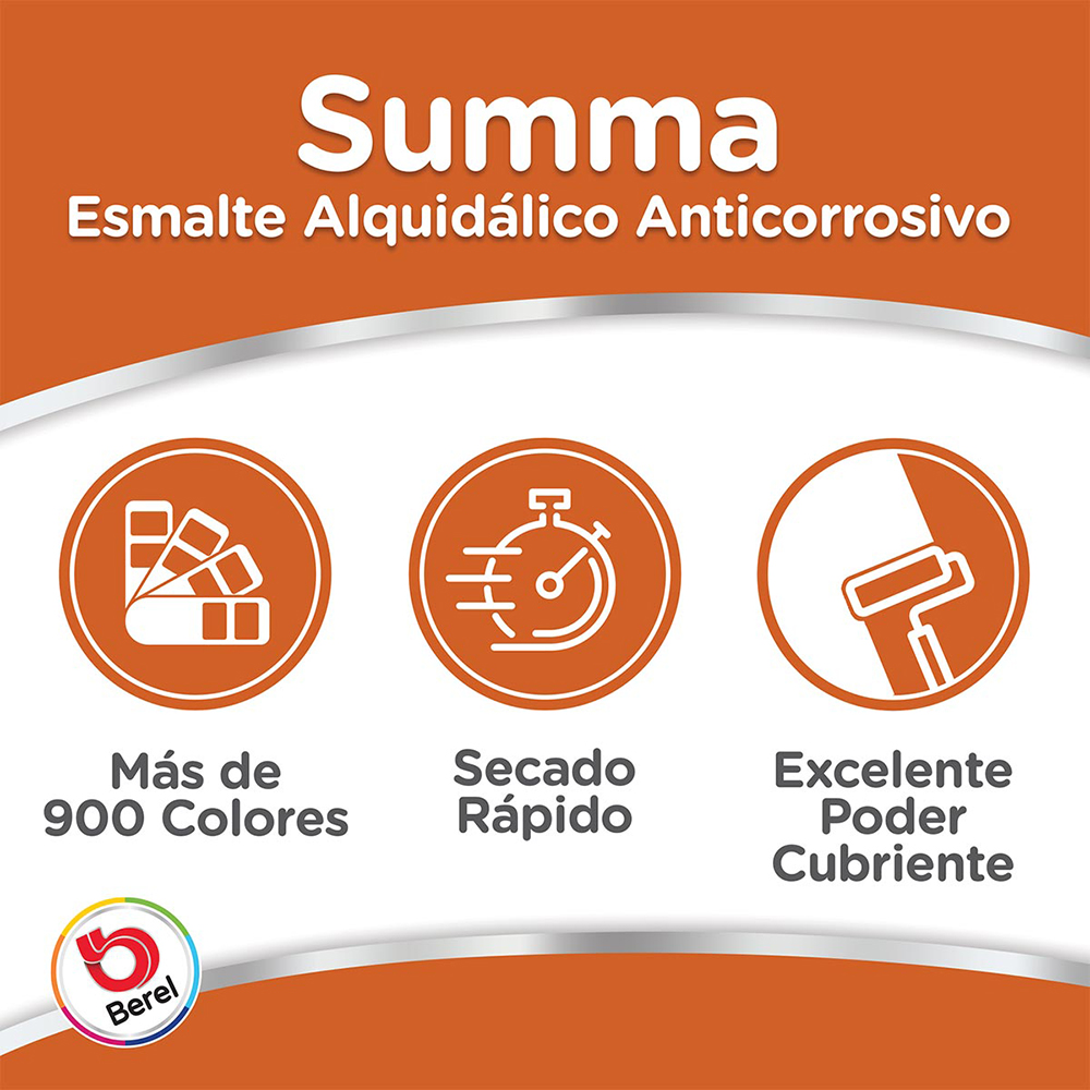 Pintura Berel Summa Alquidálico para interior/exterior, presentación de 19l en base tint, acabado brillante. Para superficies de fierro, acero, madera, yeso o cemento. Tiene un rendimiento de 4.5 a 9.5 m/L. Ofrece beneficios como secado rápido, excelente adhesión, dureza y gran rendimiento.