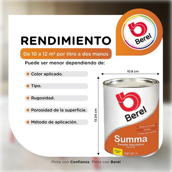 Esmalte alquidálico Summa Berel color negro de acabado mate y secado rápido. Útil para aplicar en interiores sobre superficies de fierro, acero, madera, yeso o cemento. Presentación de 1 L.