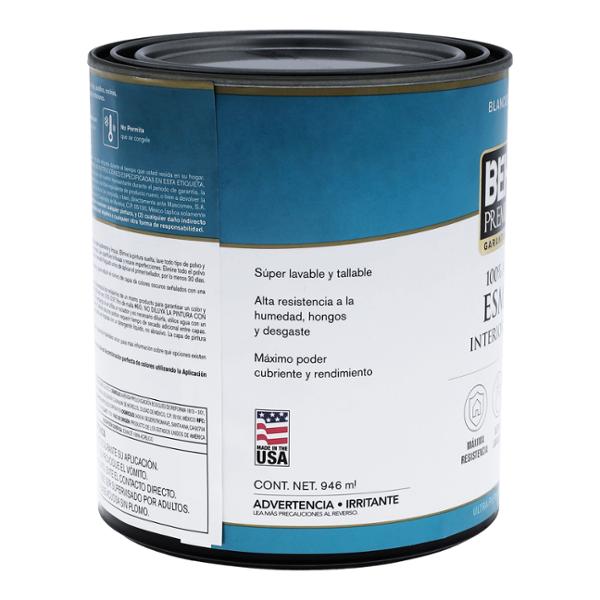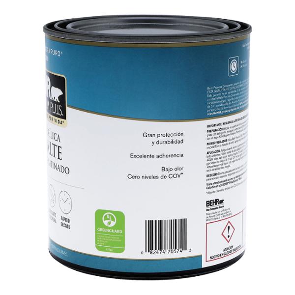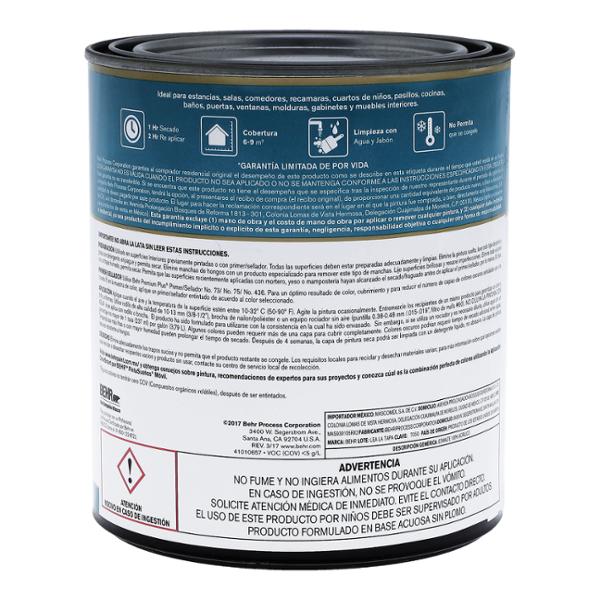 Esmalte y primer Behr Premium Plus interior satinado. 100% acrílica, entintable en colores claros, brinda un acabado satinado especial para superficies interiores como comedores, pasillos cocinas y baños. Su fórmula ecológica tiene cero niveles de cov y bajo olor, tiene máxima resistencia a la humedad, hongos y desgaste, además de ser 100% lavable con agua y jabón. Cuenta con secado rápido de 1 hora y 2 horas para segunda mano. Su presentación es en litro de 946 ml que brinda un rendimiento de 12 a 14 m2 con excelente cobertura que bloquea y elimina las manchas comunes que se encuentran en el hogar. Para aplicación con brocha o rodillo se debe utilizar directamente, sin diluir la mezcla.