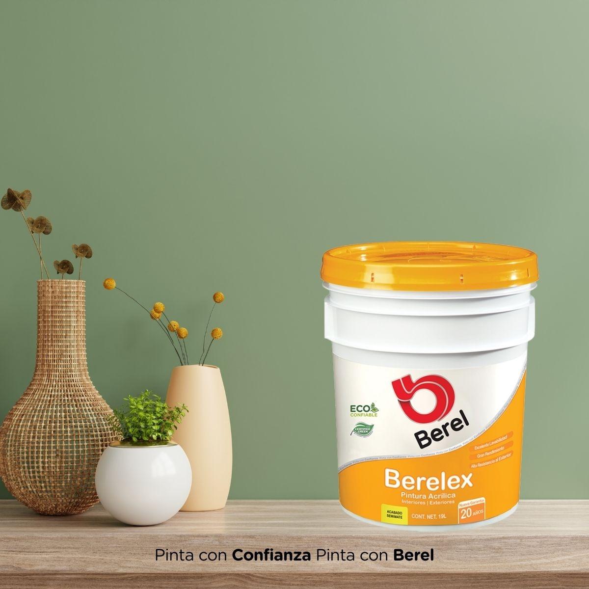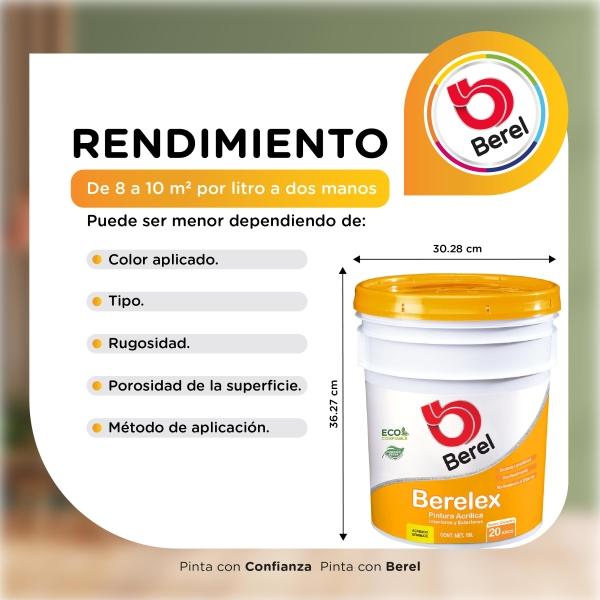 Pintura Berel Berelex Vinil Acrílica para interior/exterior, presentación de 19L. en base deep, acabado semimate. Para superficies de yeso, ladrillo, cemento y mortero. Tiene un rendimiento de 8 a 10 m/L. Ofrece beneficios como alta resistencia al exterior y facil de desmanchar. Garantía de 20 años.