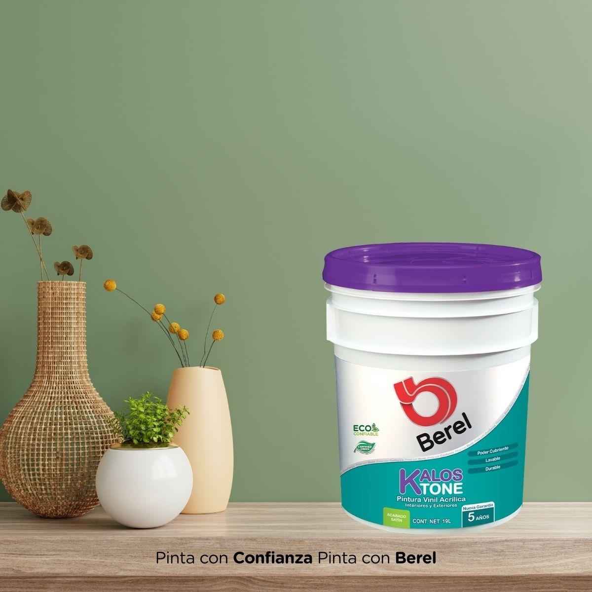 Pintura Berel Kalos-Tone Vinil Acrílica para interior/exterior, en presentación de 19l en base tint acabado satinado. Ideal para superficies de yeso, ladrillo, cemento y mortero. Tiene un rendimiento de 6 a 7 m/L. Ofrece beneficios como excelente poder cubriente, posee muy buena resistencia al lavado, giseo y decoloración. Ideal cuando se requiere una opción de buena calidad y económica. Cuenta con garantía 5 años.