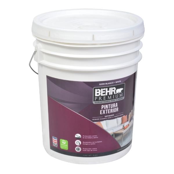 Pintura acrílica Behr Premium, entintable en colores claros, brinda un recubrimiento especial para exteriores como revestimiento de madera, vinilo y de fibra de cemento como mortero, ladrillo, mampostería y enrejado, deja acabado satinado. Cuenta con una fórmula resistente a la humedad, hongos y salitres, tiene protección contra cualquier tipo de clima, además de ser lavable con agua y jabón. Cuenta con secado rápido 2 horas al tacto. Su presentación es en cubeta de 18.60 L que brinda un rendimiento de 116 a 186 m2 con excelente cobertura. Para su aplicación con brocha o rodillo se debe utilizar directamente, sin diluir.