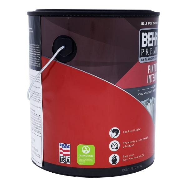 Pintura acrílica Behr Premium, entintable en colores oscuros, brinda un recubrimiento especial para interiores como estancias, salas, comedores y recámaras con acabado mate, ideal para disimular imperfecciones. Su fórmula es ecológica, y tiene bajos niveles de COV y bajo olor, es resistente a la humedad y hongos, además de ser lavable con agua y jabón. Cuenta con secado rápido 2 horas al tacto. Su presentación es en galón de 3.43 L que brinda un rendimiento de 23 a 37 m2 con excelente cobertura. Para su aplicación con brocha o rodillo se debe utilizar directamente, sin diluir.