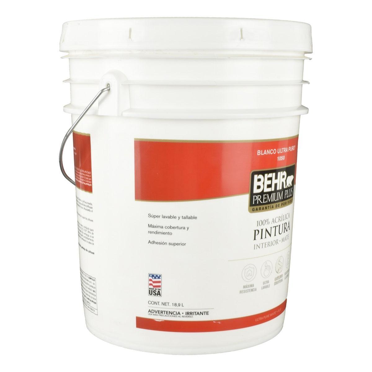 × BEHR PREMIUM PLUS PINTURA 100% ACRÍLICA PARA INTERIOR BEHR PREMIUM PLUS 18.9 L MATE BASE BLANCO ULTRA PURO