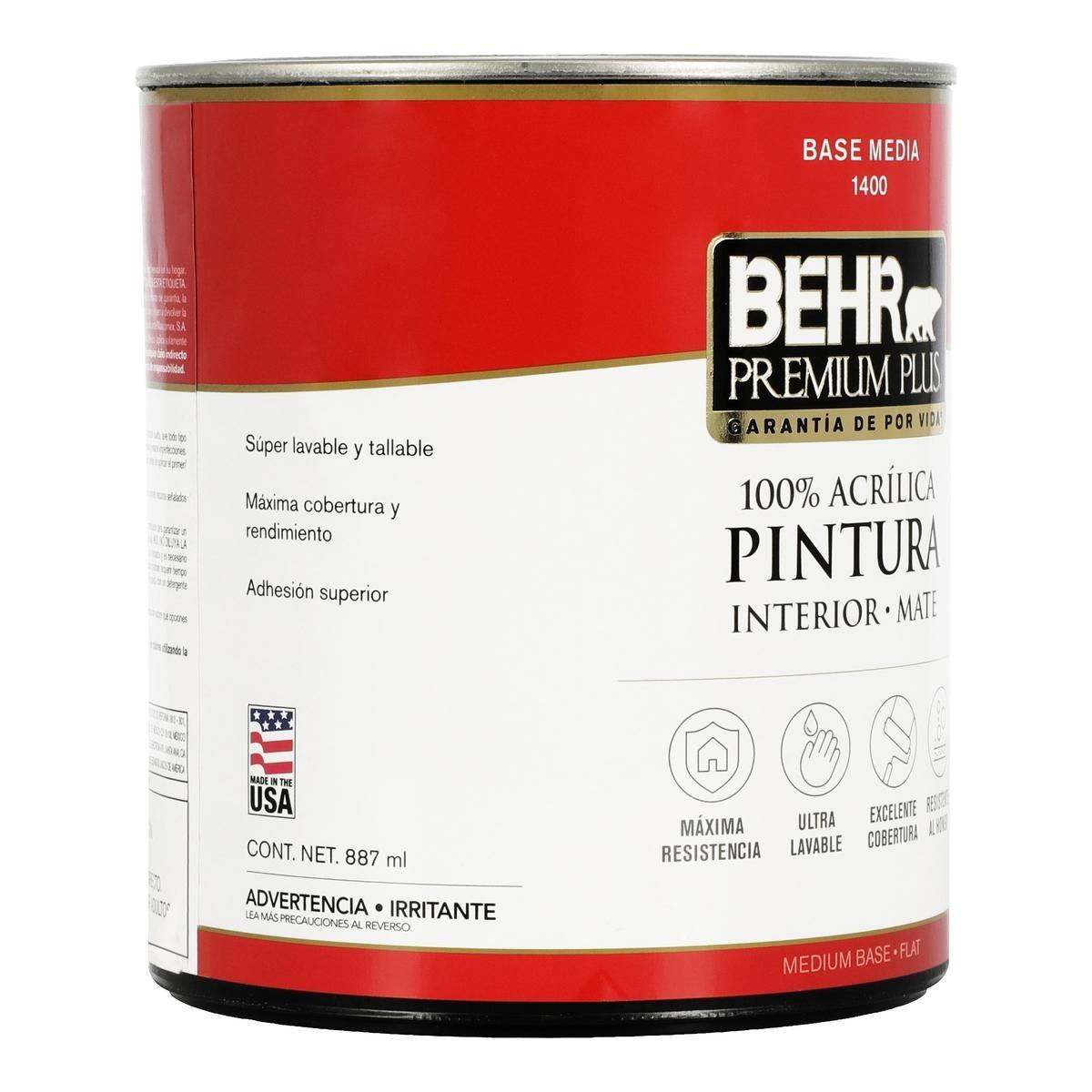 Pintura y primer Behr Premium Plus interior mate. 100% acrílica, entintable en colores medios, brinda un acabado mate especial para superficies interiores como salas, comedores, recámaras y techos. Su fórmula ecológica tiene cero niveles de cov y bajo olor, tiene máxima resistencia a la humedad, hongos y desgaste, además de ser 100% lavable con agua y jabón. Cuenta con secado rápido de 1 hora y 2 horas para segunda mano. Su presentación es en litro de 887 ml que brinda un rendimiento de 12 a 14 m2 con excelente cobertura que bloquea y elimina las manchas comunes que se encuentran en el hogar. Para aplicación con brocha o rodillo se debe utilizar directamente, sin diluir la mezcla.