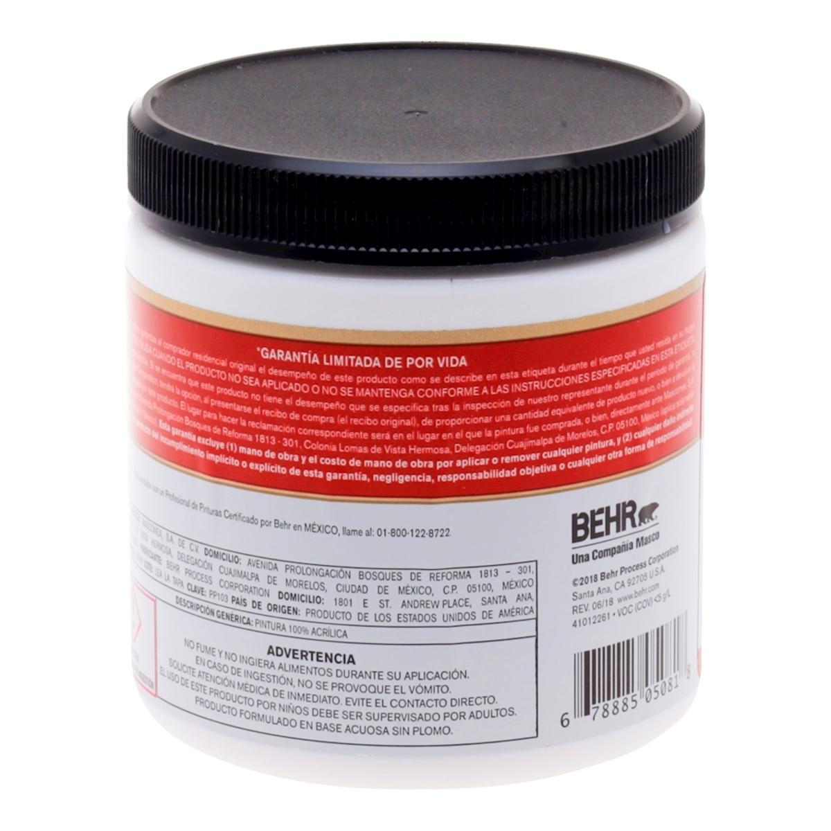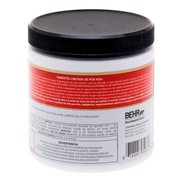 Muestra de color 100% acrílica Behr Premium Plus de 214 ml, entintable en colores oscuros, permite visualizar el color antes de pintar en interiores o exteriores, su acabado mate es ideal para disimular imperfecciones. Sus 214 ml cubren 1 m2. Los códigos de colores de pintura que se muestran en pantalla son aproximados por lo que el producto aplicado podría variar.