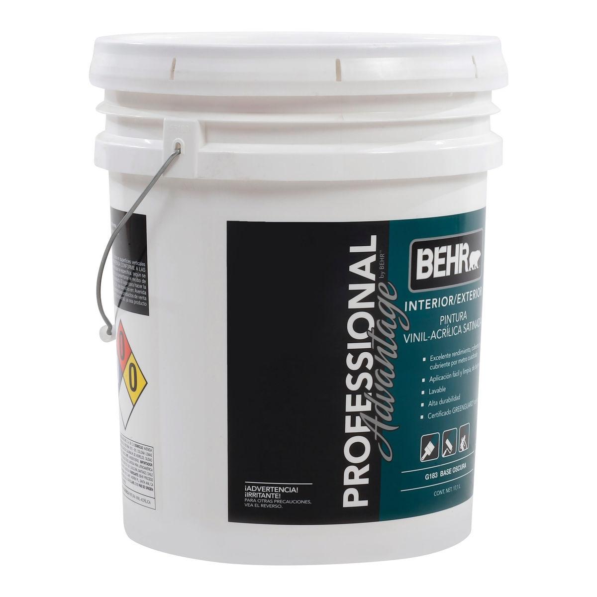 Pintura vinil acrílica Professional Advantage by Behr, entintable en colores oscuros, ofrece un acabado satinado para interiores o exteriores, de fácil aplicación, bajo salpicado y lavable. Tiene una cobertura de 116-186 m2..