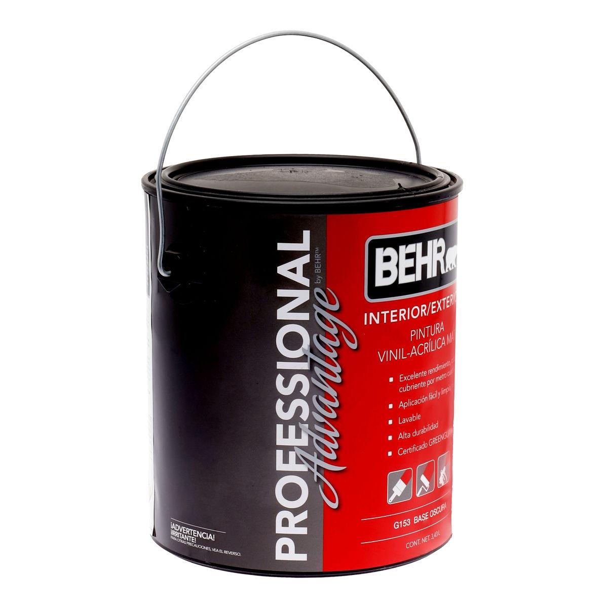 Pintura vinil acrílica Professional Advantage by Behr, entintable en colores oscuros ofrece un acabado mate para interiores o exteriores, de fácil aplicación, bajo salpicado y lavable. Tiene una cobertura de 23 a los 37 m2