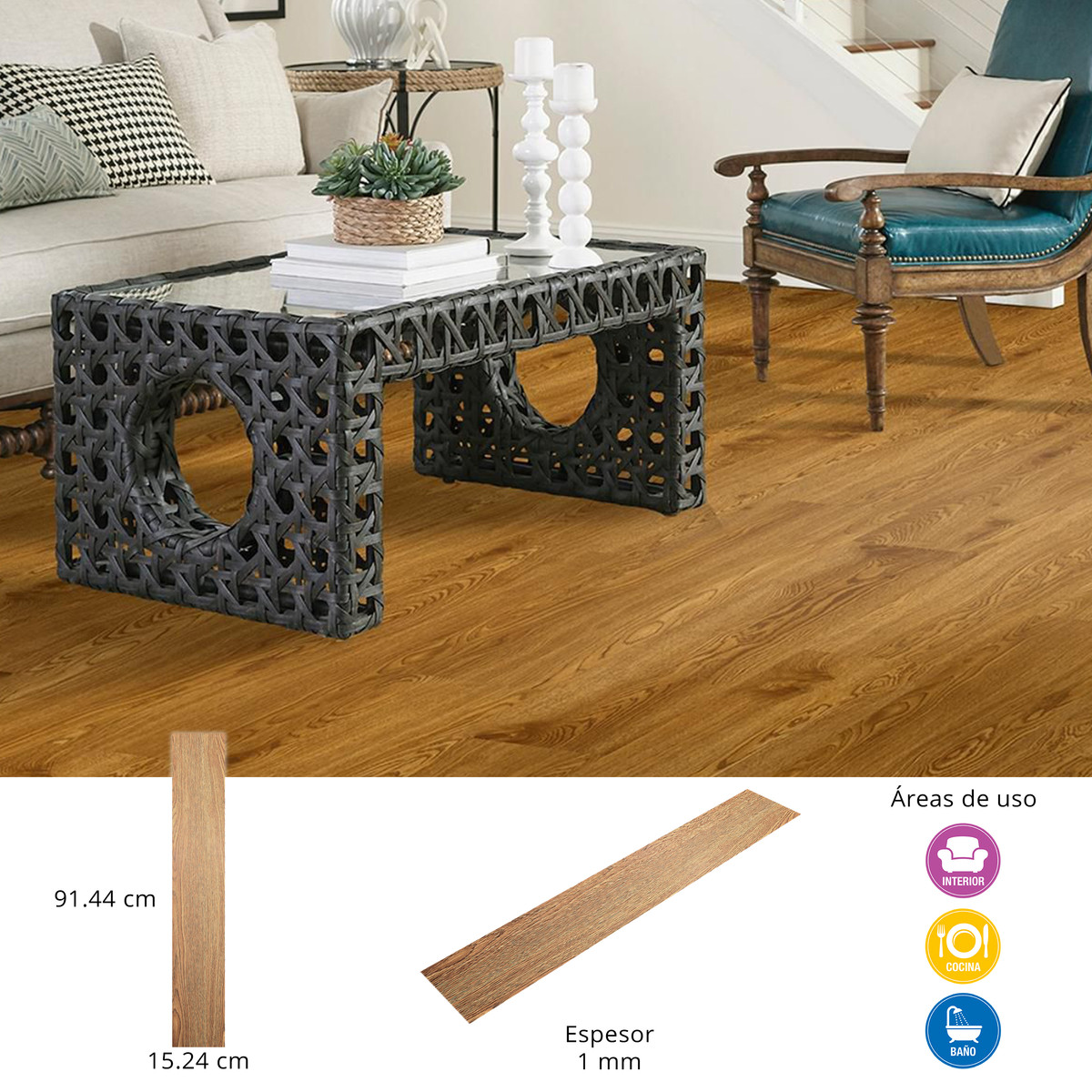 PISO VINÍLICO AUTOADHERIBLE TIPO MADERA 15.24 X 91.44 CM MIEL CAJA CON 3.34 M2
