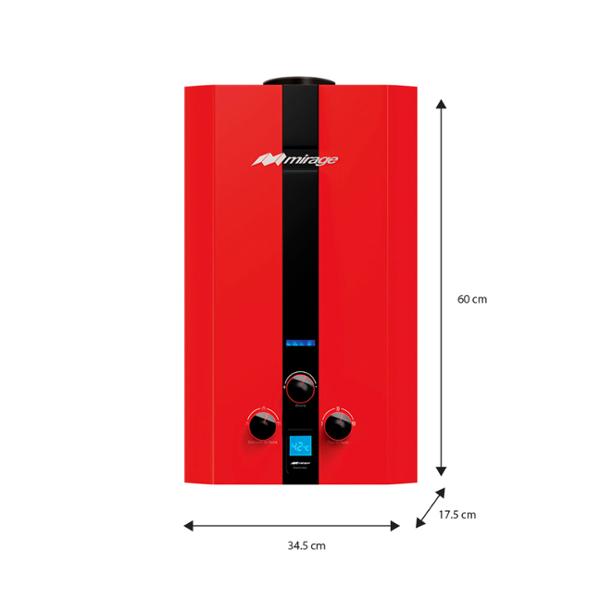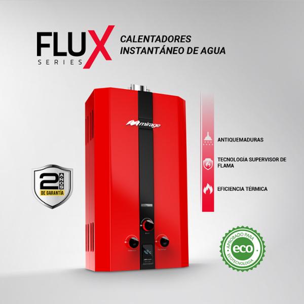 Disfruta una temperatura confortable con tu nuevo calentador de agua flux rojo gas natural de 10 litros de mirage. Nuestra línea de equipos de boilers de paso son ideales para adaptarse a tus necesidades, este modelo puede abastecer hasta dos fuentes de agua con 10 litros por minuto. Es ideal para lugares con baja presión de agua, ya que con solo 2.17 psi de presión se habilita su funcionamiento. Cuenta con un display digital donde podrás obtener visualizar la temperatura en tiempo real. Ahorra hasta un 70% en tu consumo de gas., gracias a la tecnología energy saver y su encendido automático. Disfruta la temperatura ideal con tu nuevo calentador flux de mirage.