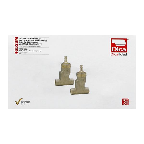 Juego de llaves de empotrar soldables 1/2 pulgada Dica sin manerales, útil en la instalación del sistema hidráulico de la regadera. Cuenta con cartucho de vástago ascendente que permite una apertura sencilla para el flujo de agua.
