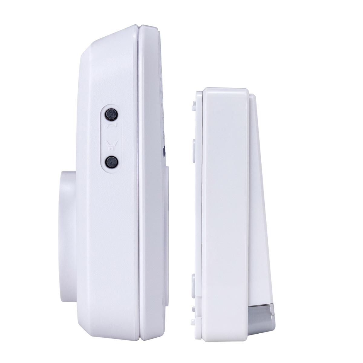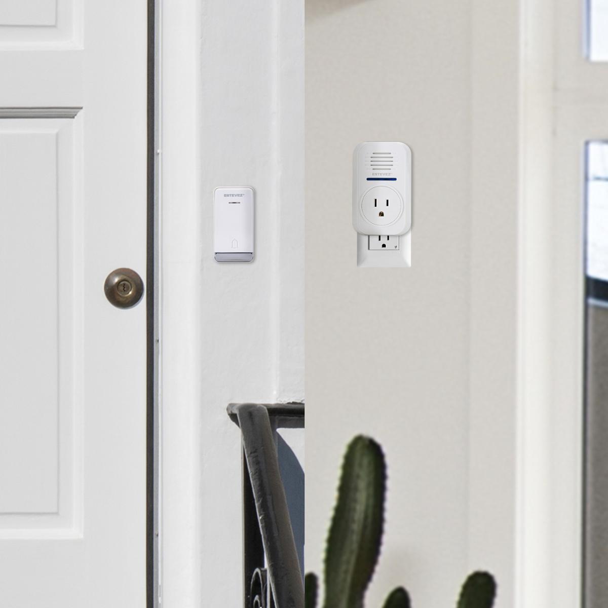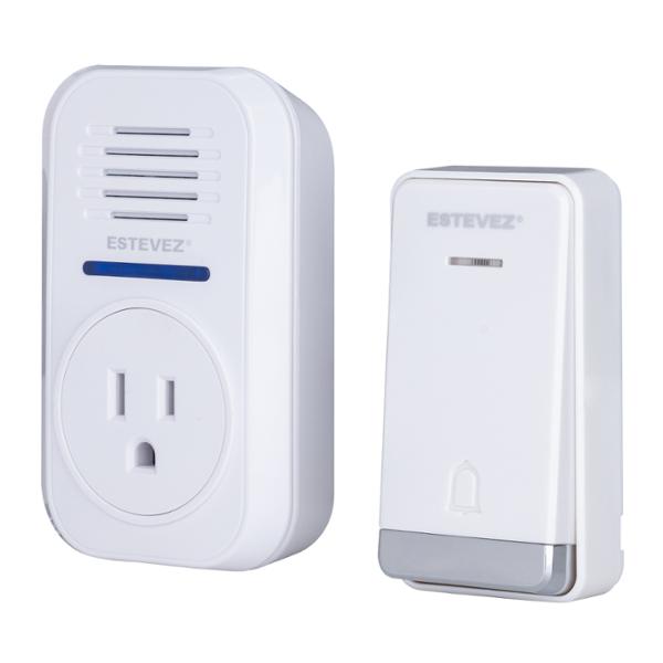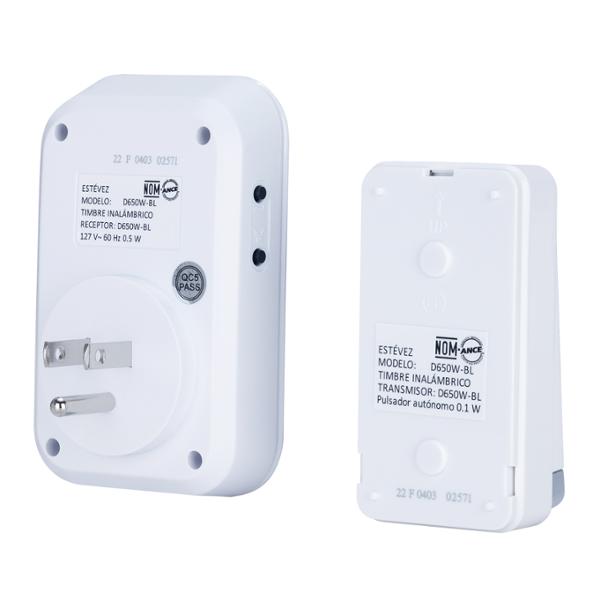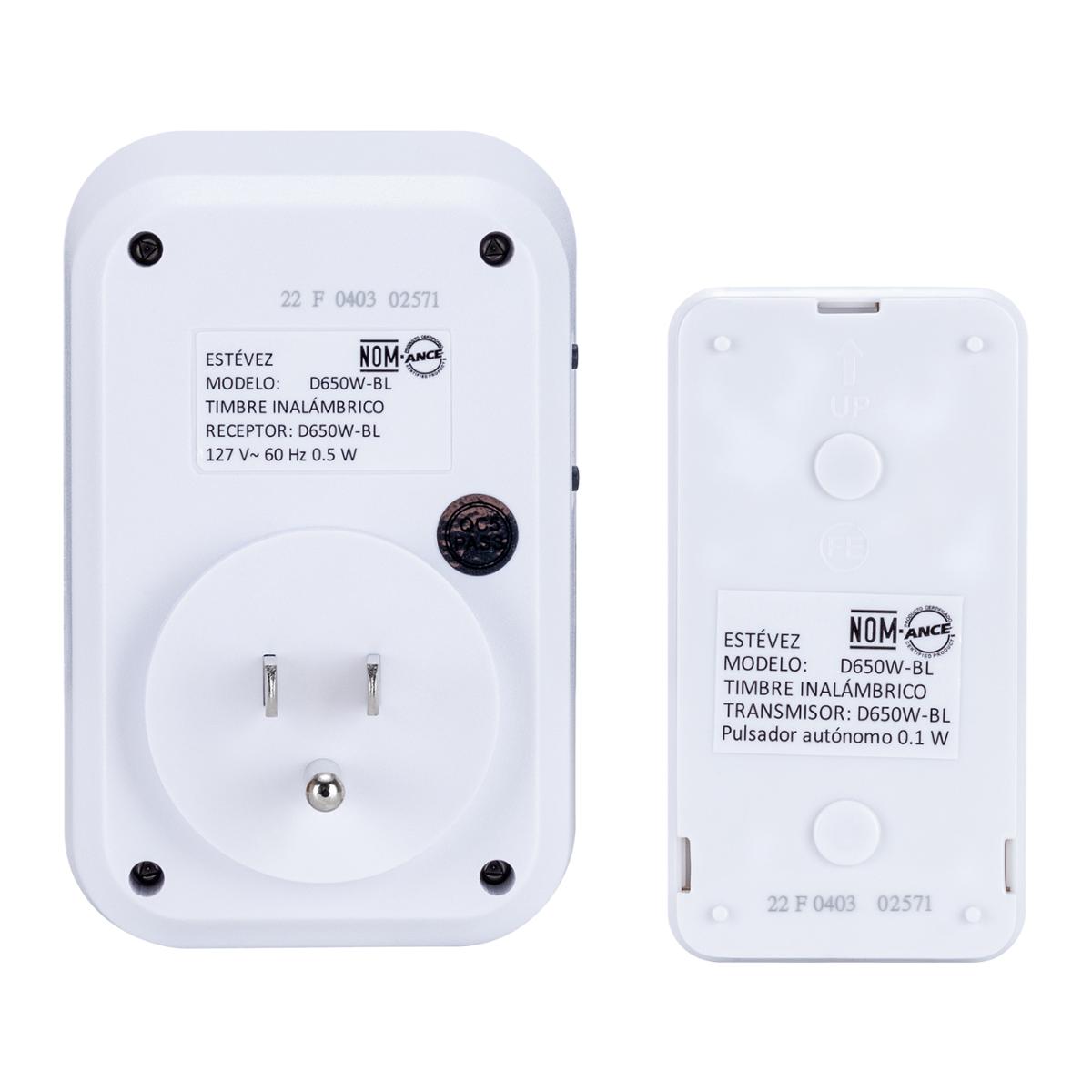 Timbre inalámbrico con botón transmisor autónomo Estévez, está elaborado con una estructura rectangular de plástico en color blanco adecuado para uso exterior; cuenta con treinta y dos melodías a elegir y cinco niveles de volumen. El rango de alcance entre la distancia de transmisión y recepción es de 150 m en área abierta, apto para usar en casas, edificios o departamentos. Posee un IP44 (transmisor) y receptor de baterías. Cuenta con un sistema de fácil instalación, sin necesidad del cableado y un instructivo para lograr un mejor funcionamiento y durabilidad. Trabaja con una tensión de 127 volts y una potencia máxima de 1000 watts.