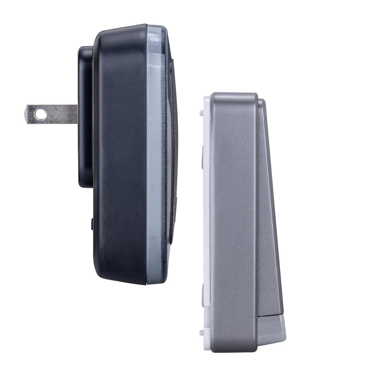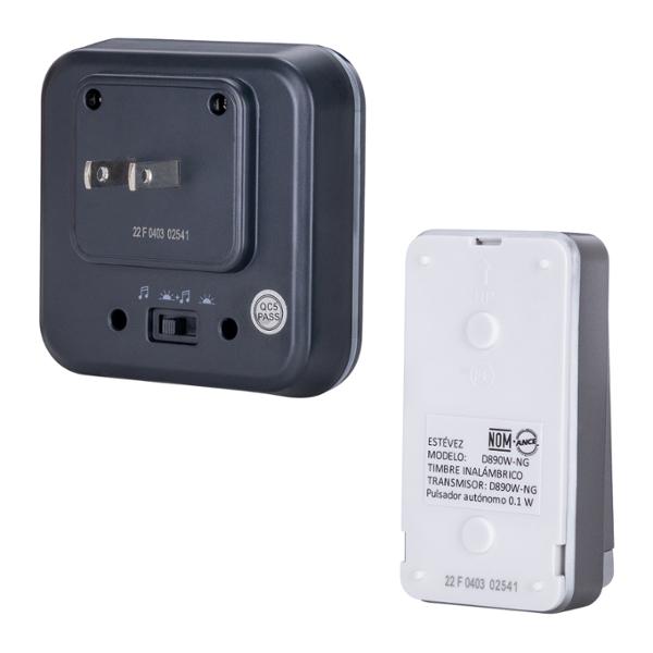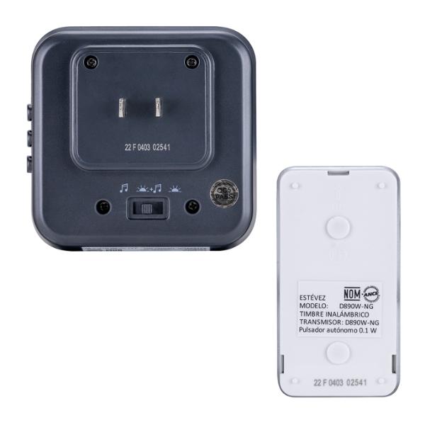 Timbre inalámbrico Altar Estévez, es un elemento adecuado para el hogar, oficina, áreas de recepción, tiendas, entre otros lugares que requieran un sonido que sirva como aviso de llamado a la puerta. Está diseñado para operar a una distancia máxima de 150 m en interiores (el pulsador puede ser instalado en exteriores bajo techo), con cuatro niveles de volumen y 32 melodías diferentes, además opera con una tensión de 127 volts, 60 hertz, El receptor de plástico con indicador LED es enchufable, tiene una medida de 8.2 x 8.2 x 5.4 cm y el transmisor funciona con energía cinética por lo que es autónomo y sus medidas son 8.2 x 4.4 x 2.9 cm, está hecho de plástico en color negro con protección IP44 para uso en exteriores bajo techo.