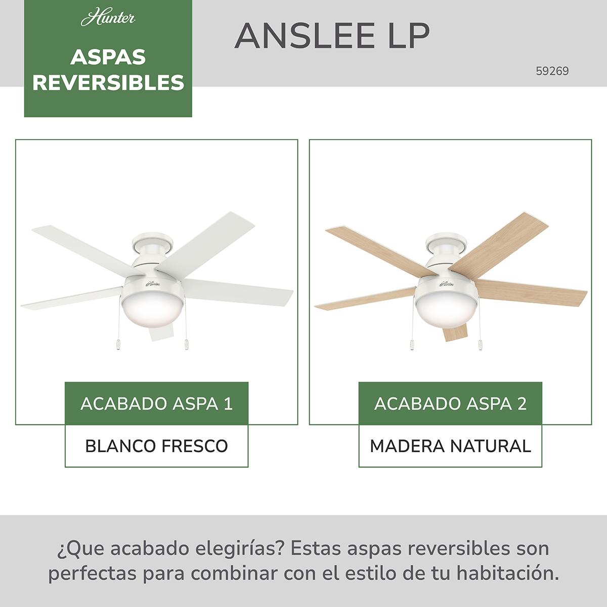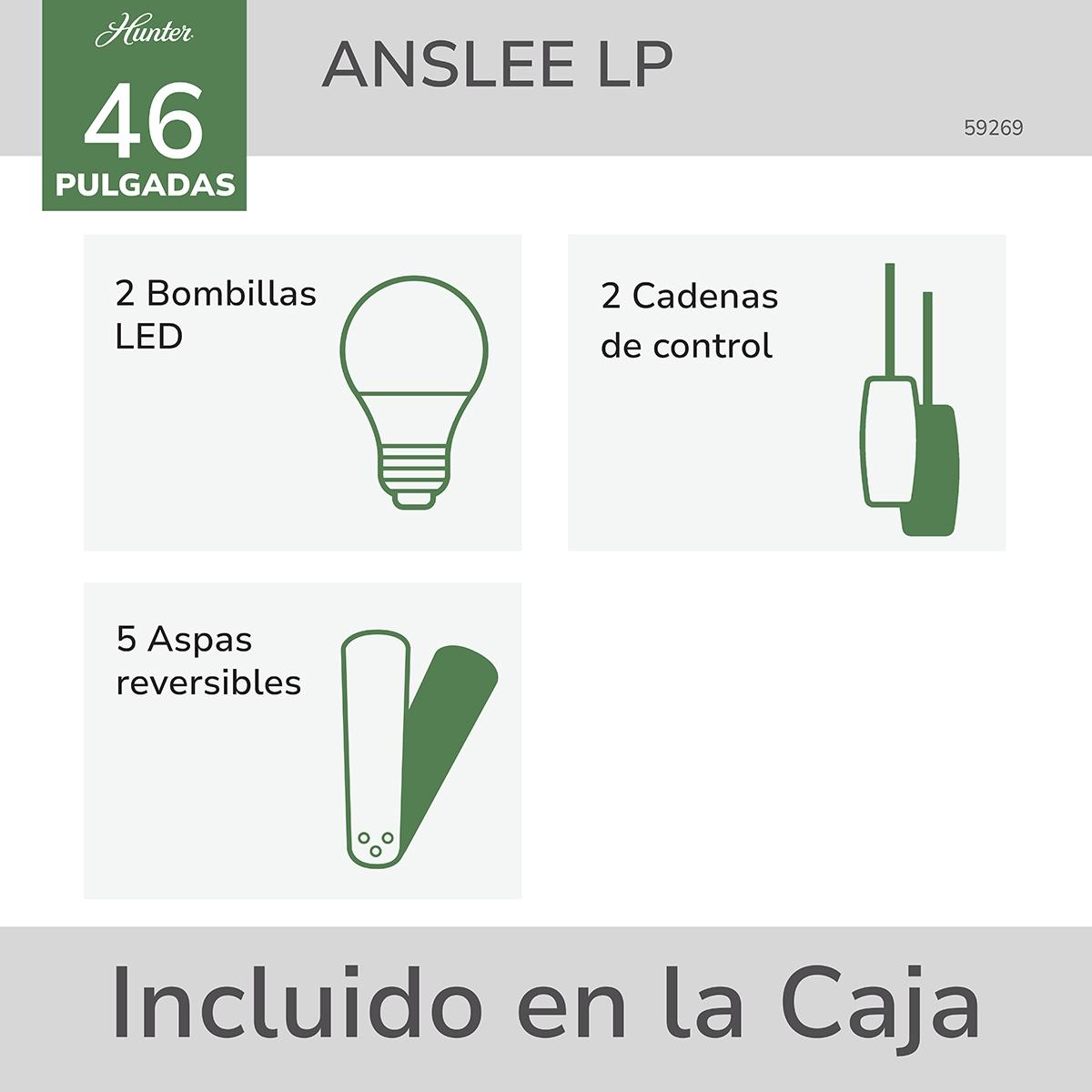 Ventilador de techo Anslee de 46 pulgadas Hunter, elemento decorativo para interiores. Otorga una agradable circulación de aire fresco en los espacios del hogar u oficina debido a sus 5 aspas y su motor reversible WhisperWind.