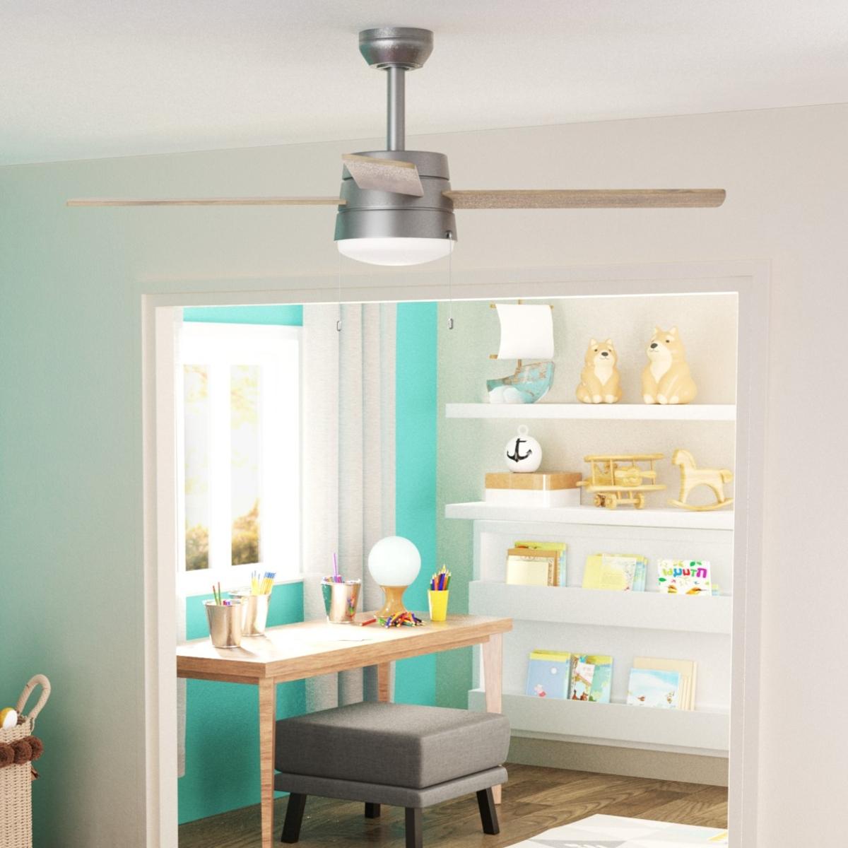 Abanico de techo Caprice de 44 pulgadas Hampton Bay, elemento decorativo para interiores. Sus 3 aspas ofrecen una agradable circulación de aire fresco en los espacios del hogar u oficina. Tiene un acabado en níquel cepillado con aspas en madera de grafito, plafón de vidrio escarchado y un motor de corriente alterna reversible que ofrece tres velocidades. Tiene un diseño moderno que le proporciona notoriedad y elegancia. Cuenta un foco LED de 18 watts de potencia, con una vida útil de 50,000 horas; sus 1,172 lúmenes ofrecen una temperatura de color de 3,000 k. El cable para su instalación mide 137.16 cm.